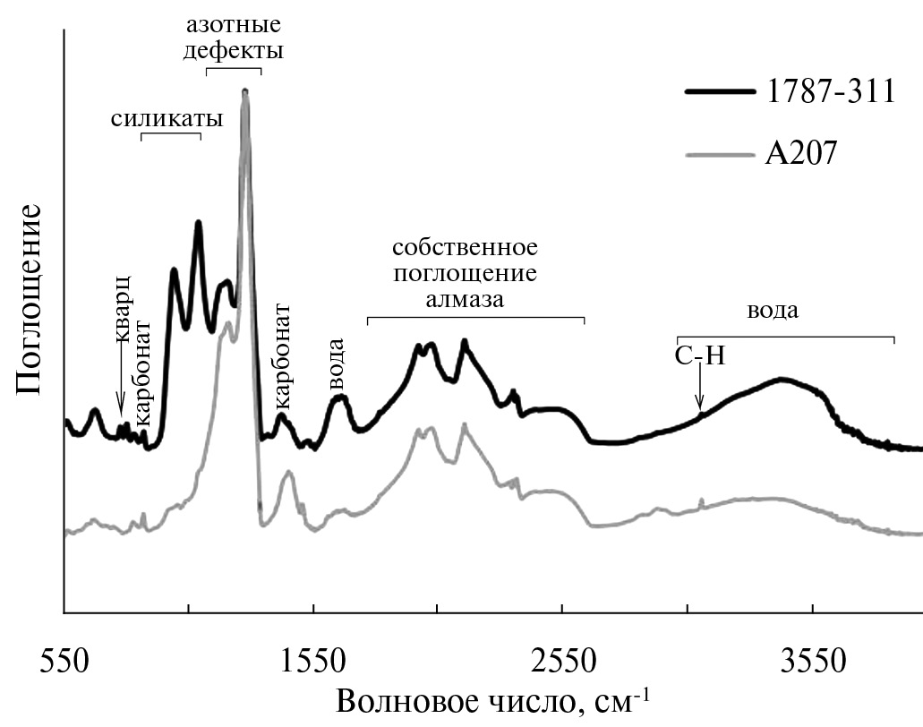 Рис. 2. Представительные ИК-спектры алмаза в «оболочке» (1787-311) и алмаза кубического габитуса (А207) с микровключениями из месторождения им. М.В. Ломоносова. На спектре отмечены полосы поглощения, относящиеся к структурным азотным дефектам и собственному поглощению алмаза, а также полосы, связанные с присутствием в микровключениях воды, карбонатов и силикатов.