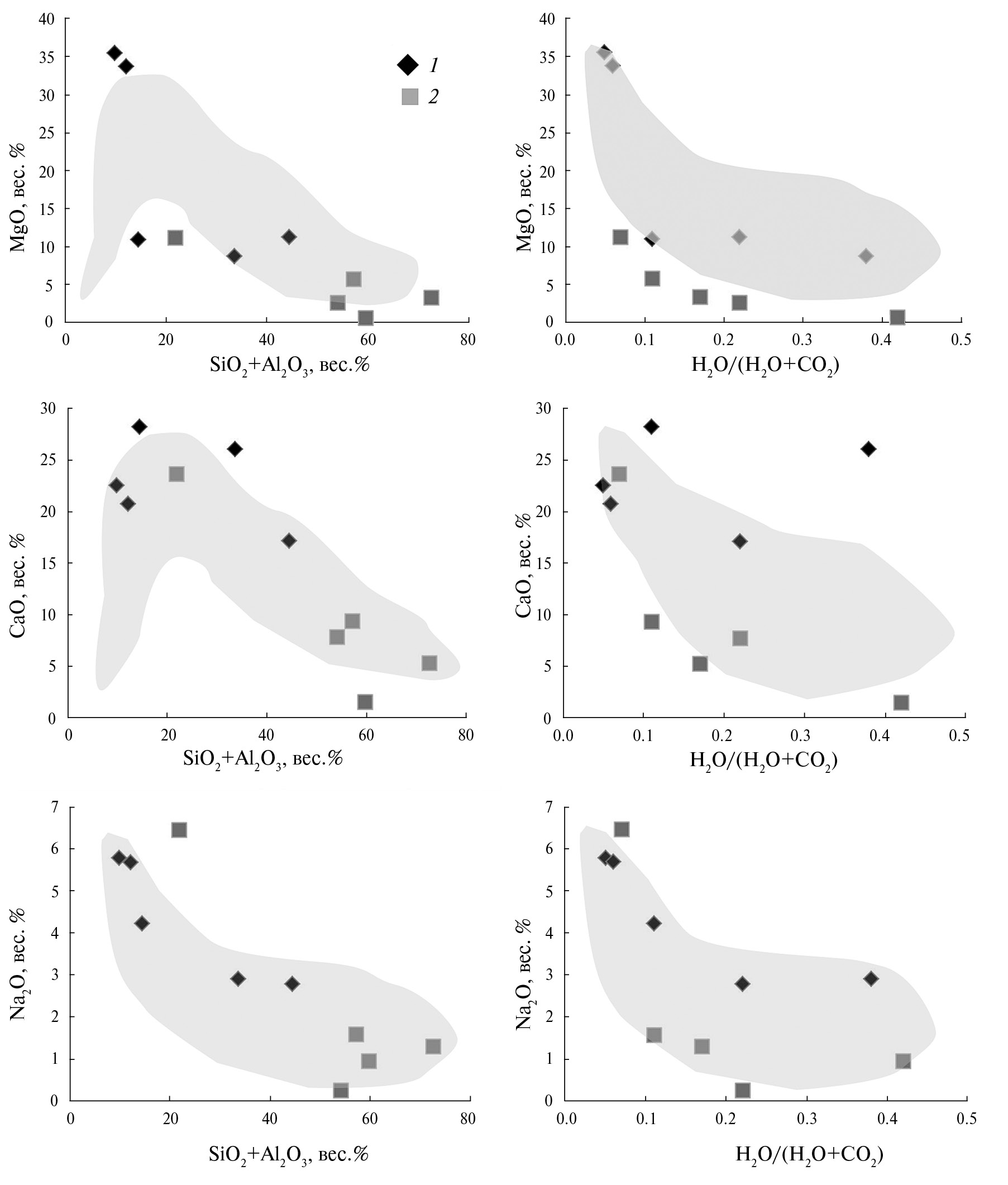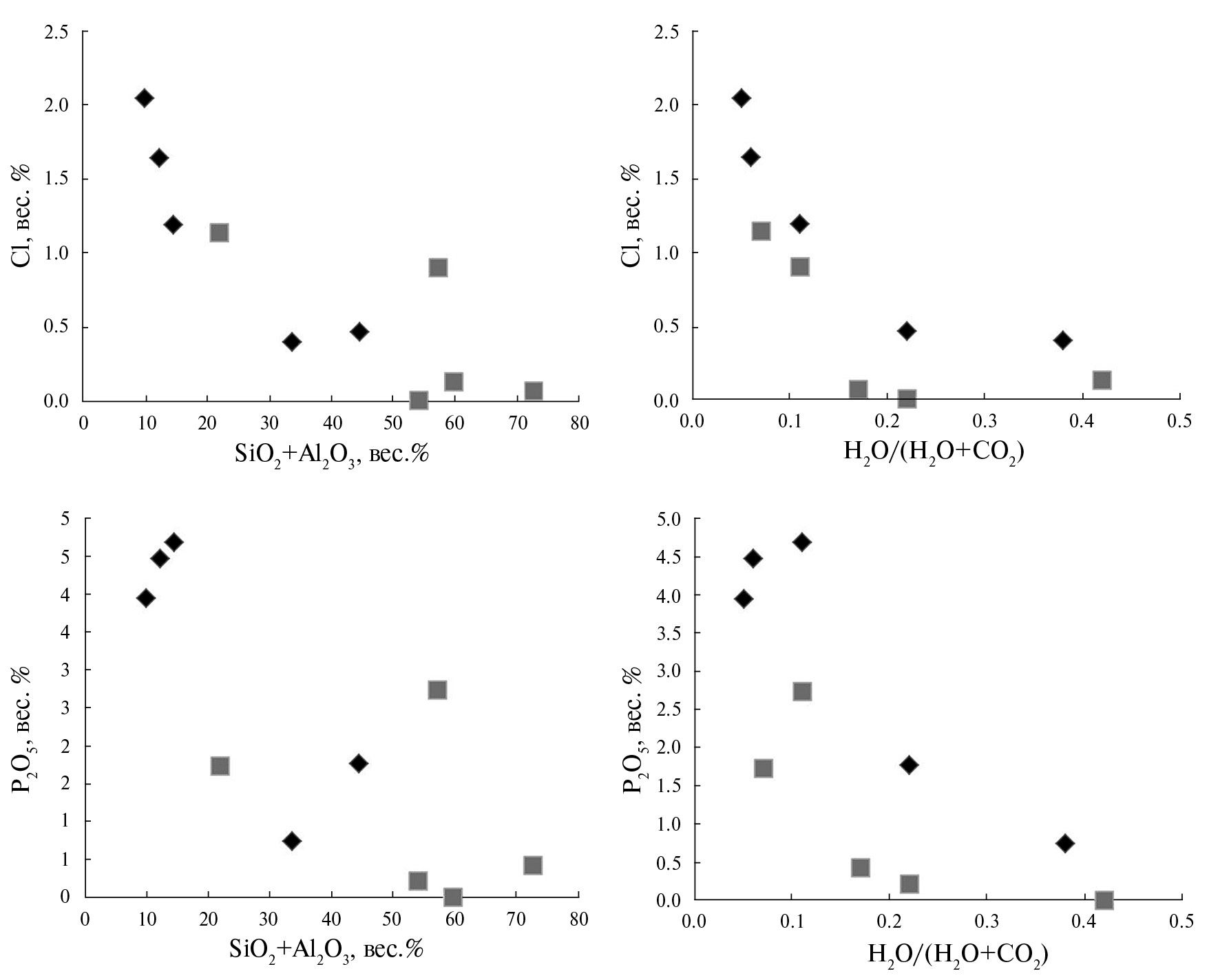 Полученные результаты позволяют определить некоторые важные межкомпонентные зависимости состава микровключений (рис. 3). С увеличением содержания SiO2 + Al2O3 и соотношения Н2О/(Н2О + СО2) для изученных алмазов наблюдается уменьшение содержания MgO, CaO, Na2O, Cl и P2O5.
