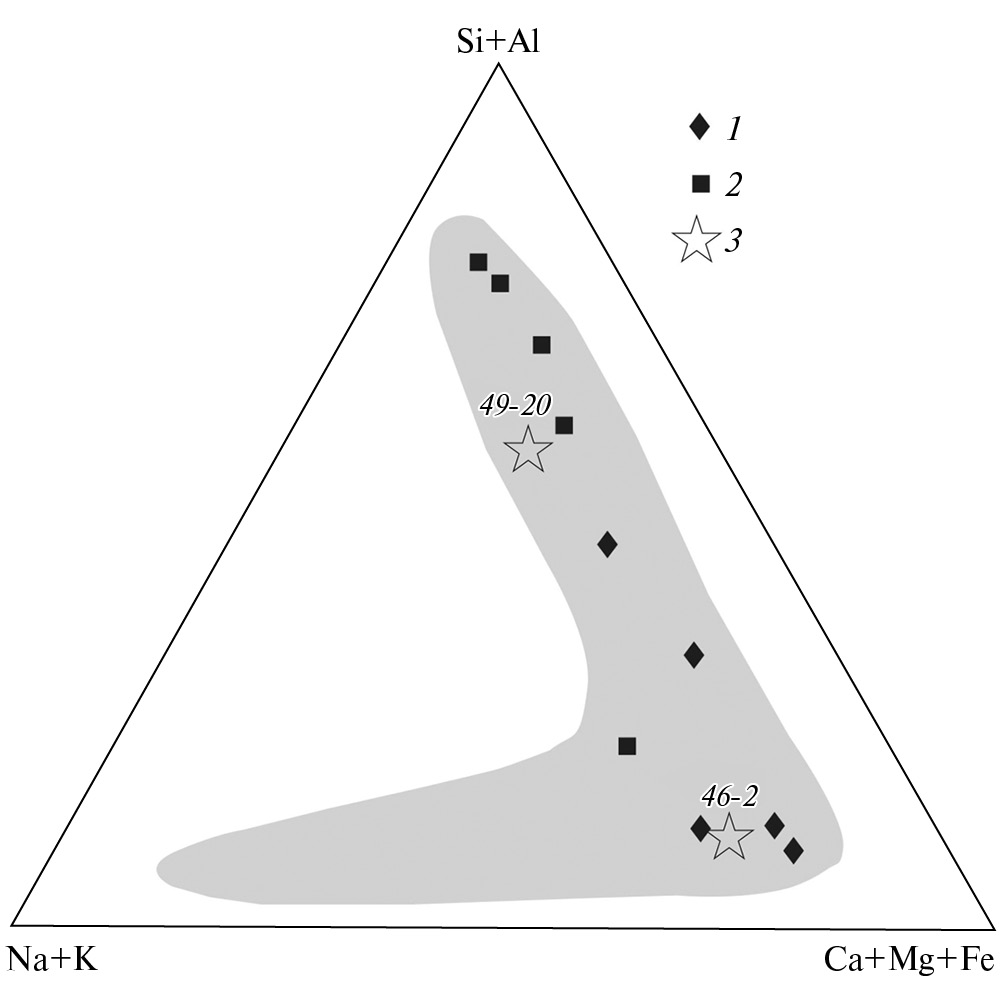 Рис. 4. Вариации состава микровключений в алмазах месторождения им. М.В. Ломоносова: 1 ― алмазы «в оболочке», 2 ― кубоиды. Показаны также вариации состава микровключений в алмазах из трубки им. В. Гриба (Архангельская провинция) (3) и в алмазах из разных месторождений мира (выделено серым полем) (по данным из работы Zedgenizov et al., 2017).