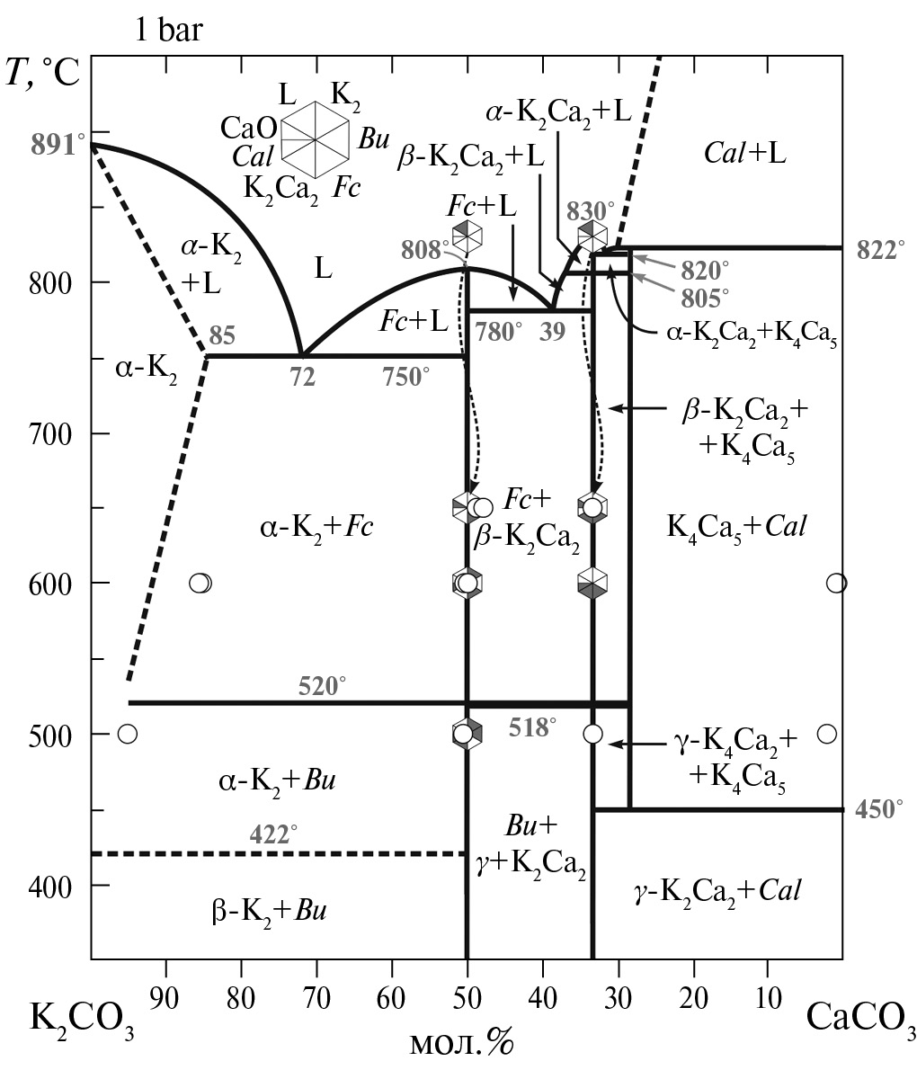 Рис. 1. T–X-фазовая диаграмма системы K2CO3-CaCO3 при 1 атм (Arceo, Glasser, 1995). Кружками показаны составы сосуществующих твердых фаз, полученных в данной работе, измеренные EDS. Заполненные сегменты в шестиугольниках обозначают присутствующие фазы. Серые числа обозначают состав эвтектики и перетектик в мол.% K2CO3. Заполненные сегменты в шестиугольниках обозначают присутствующие фазы. Условные обозначения: Cal ― кальцит, K2 ― твердый раствор CaCO3 в карбонате калия, Bu ― бючлиит K2Ca(CO3)2, Fc ― файрчильдит K2Ca(CO3)2, K2Ca2 ― K2Ca2(CO3)3, L ― жидкость.