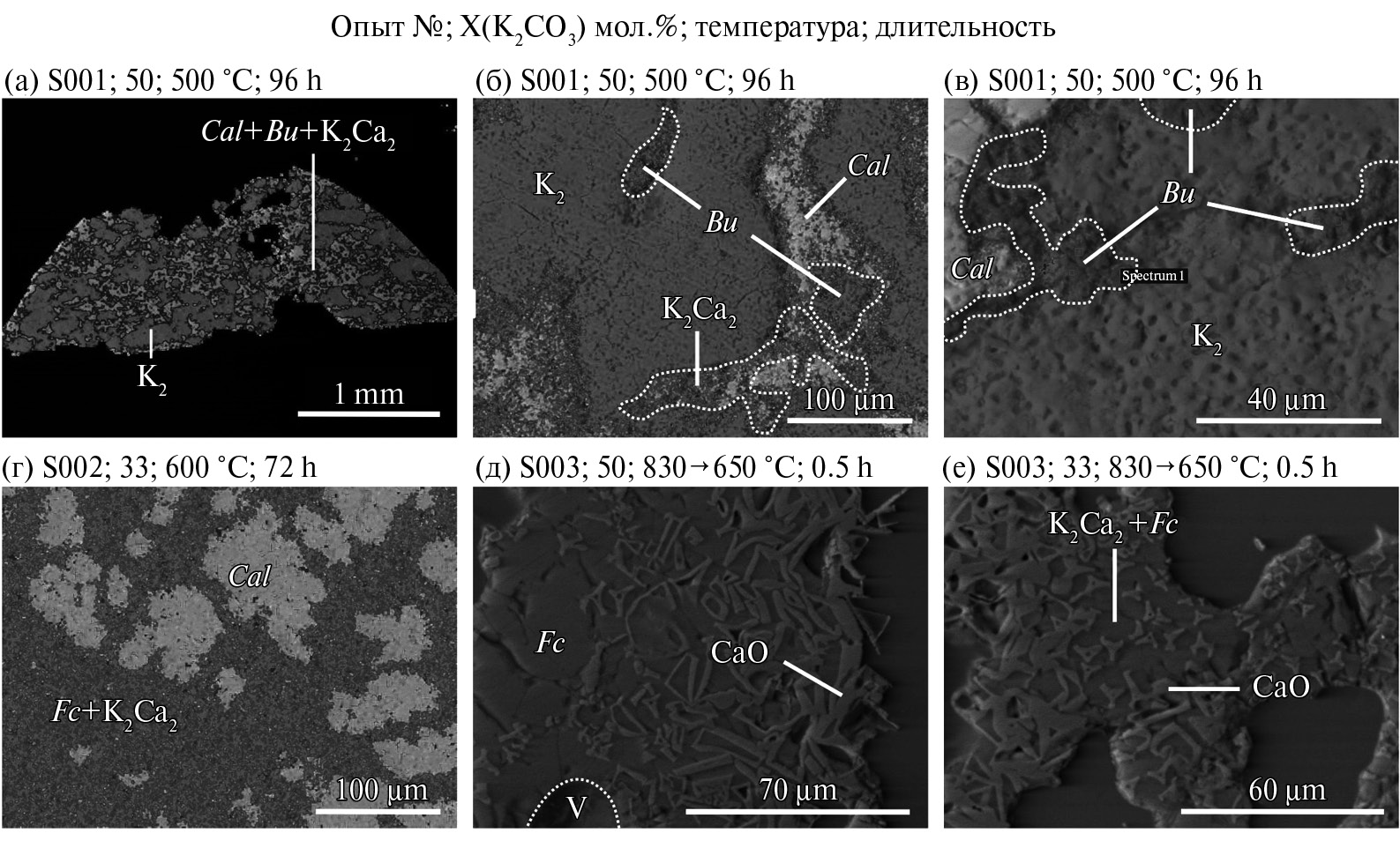 Рис. 2. BSE-изображения, иллюстрирующие фазовый состав продуктов экспериментов по синтезу K−Ca карбонатов при 1 атм. Условные обозначения: Cal ― кальцит, K2 ― твердый раствор CaCO3 в K2CO3, Bu ― бючлиит K2Ca(CO3)2, Fc ― файрчильдит K2Ca(CO3)2, K2Ca2 ― K2Ca2(CO3)3, V ― округлая полость, предположительно CO2.