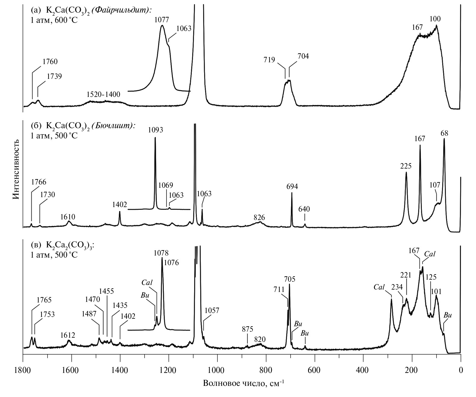 Бючлиит. Рамановский спектр K2Ca(CO3)2, синтезированного в поле стабильности бючлиита при 500°С, представлен на рис. 3б. Наиболее интенсивный пик, соответствующий двум компонентам симметричных валентных C–O колебаний ν1(CO32−), установлен при 1093 см−1 (рис. 3б, табл. 2). Отсутствие дополнительных пиков в области колебаний ν1 свидетельствует о том, что CO32− занимает только одну позицию в структуре бючлиита. В области внеплоскостных деформационных колебаний ν2 выявлен пик с частотой 826 см−1 (рис. 3б, табл. 2). В области асимметричных валентных колебаний, соответствующих ν3(CO32−), обнаружен пик с частотой 1402 см−1. Два пика при 640 и 694 см−1 относятся к ν4(СO32−) асимметричных плоскостных деформационных колебаний (рис. 3б, табл. 2). Также выявлены колебания в высокочастотной области спектра, соответствующей комбинационной моде ν1 + ν4 с частотами 1730 и 1766 см−1 (рис. 3б, табл. 2). В низкочастотной области спектра обнаружено три интенсивных пика, соответствующих частотам 225 см−1, 167 см−1 и 68 см−1 с плечом на частоте 107 см−1 (рис. 3б, табл. 2). Также в области спектра ν1(CO32−) установлен пик, соответствующий фазе K2CO3 (рис. 3б).