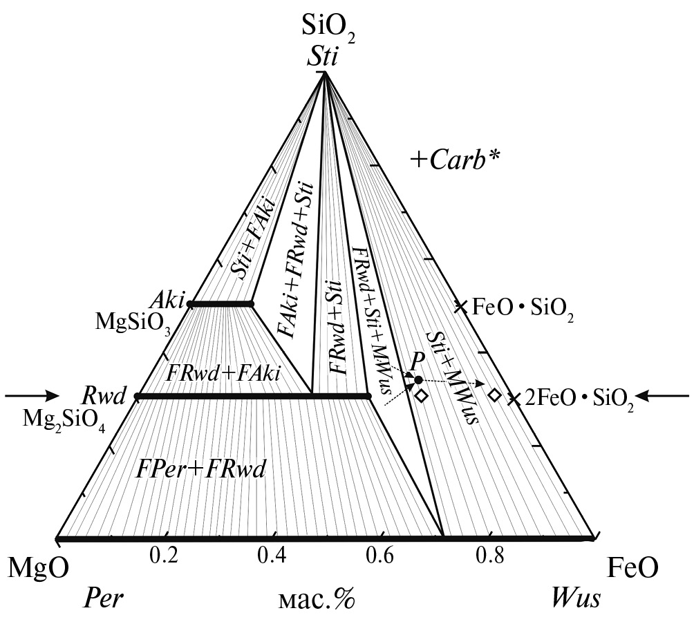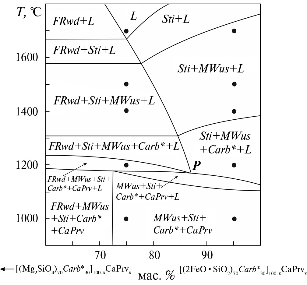 Диаграмма позволяет проследить следующие последовательности кристаллизации изучаемых карбонат-силикатных систем: для состава I ― (2FeO·SiO2)52.5(Mg2SiO4)17.5(Carb*)30: L L + FRwd L + FRwd + Sti L + FRwd + Sti + MWus L + FRwd + Sti + MWus + Carb* L + FRwd + Sti + MWus + Carb* + CaPrv; для состава II ― (Fe2SiO4)66.5(Mg2SiO4)3.5(Carb*)30: L + Sti L + MWus + Sti L + Sti + MWus + Carb* L + Sti + MWus + Carb* + CaPrv. Данные последовательности свидетельствуют о начале кристаллизации карбонатных фаз в близсолидусных условиях, а Са-перовскит впервые появляется в солидусных ассоциациях.