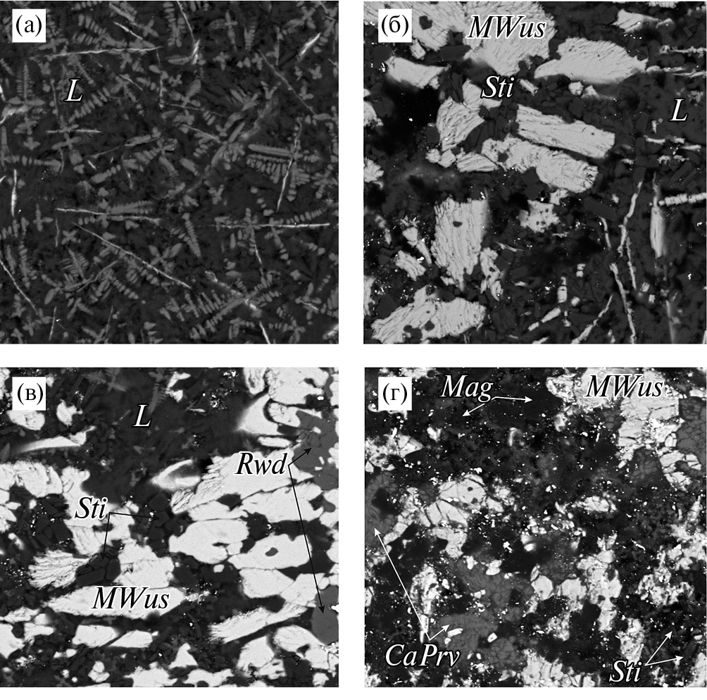 Магнезиовюстит MWus присутствует в экспериментальных образцах двух стартовых составов и представляет собой твердые растворы периклаза и вюстита. Магнезиовюститы серии (I) содержат MgO до 6.51 мас.% (в среднем 4.10 мас.%), серии (II) ― до 2.11 мас.% (в среднем 0.99 мас.%). Содержание примесных компонентов не превышает первых процентов для высокожелезистых магнезиовюститов, в то время как для вюститов серии (I) средние значения CaO определены как 2.25, Na2O ― 2.55, К2О ― 1.73 (мас.%) при 1500°С.
