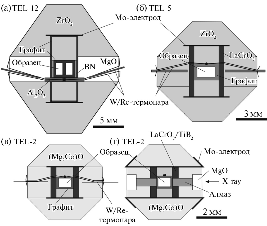 Использовали несколько конфигураций ячейки высокого давления (рис. 1). При 3−6 ГПа применяли ячейку с ребром октаэдра 20 мм и ребром треугольных рабочих площадок 12 мм (далее 20/12 мм). Схема ячейки приведена в работе (Shatskiy et al., 2013b). При 9−15 ГПа использовали конфигурацию 10/5 мм (Litasov, Ohtani, 2009b), при 20 ГПа ― 8/3.5 мм (Litasov et al., 2008b), при 25−32 ГПа ― 6.2/2.0 мм (Litasov et al., 2005).