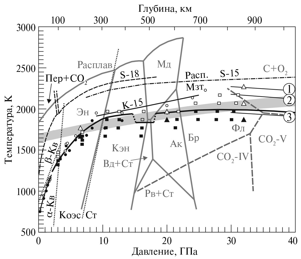 Рис. 2. Р-Т-диаграмма, показывающая положение реакции MgCO3 + CO2 (черная линия). Залитыми значками показана устойчивость реагентов, пустыми значками ― продуктов реакции. Данные настоящей работы показаны квадратами (эксперименты на ускорителе) и треугольниками (лабораторные эксперименты). Кружки ― данные других работ: 0.2−4.3 ГПа ― (Johannes, 1969; Haselton et al., 1978; Koziol, Newton, 1995), 4−26 ГПа ― (Kakizawa et al., 2015) (линия реакции из этой работы также показана тонкой сплошной линией К-15). Данные экспериментов в алмазных наковальнях: 1 ― (Seto et al., 2008), полный интервал давлений 30−80 ГПа; 2 ― (Maeda et al., 2017), 35−152 ГПа; 3 ― (Drewitt et al., 2019), 50−90 ГПа. Кривые разложения и плавления магнезита (Расп./Мзт): S-18 ― (Shatskiy et al., 2018); S-15 ― (Solopova et al., 2015). Сплошные серые линии ― фазовые соотношения в системе MgSiO3 (Gasparik, 2003). Пунктирные серые линии ― в системе CO2 (Litasov et al., 2011). Точечные черные линии ― в системе SiO2 (Gasparik, 2003). Широкой серой линией показана мантийная адиабата по (Litasov, Shatskiy, 2018). Эн ― энстатит, Кэн ― клиноэнстатит, Вд ― вадслеит, Ст ― стишовит, Рв ― рингвудит, Мд ― мэйджорит, Ак ― акимотоит, Бр ― бриджманит, α-Кв и β-Кв ― α- и β-кварц, Коэс ― коэсит; Пер ― периклаз, Фл ― СО2-флюид.