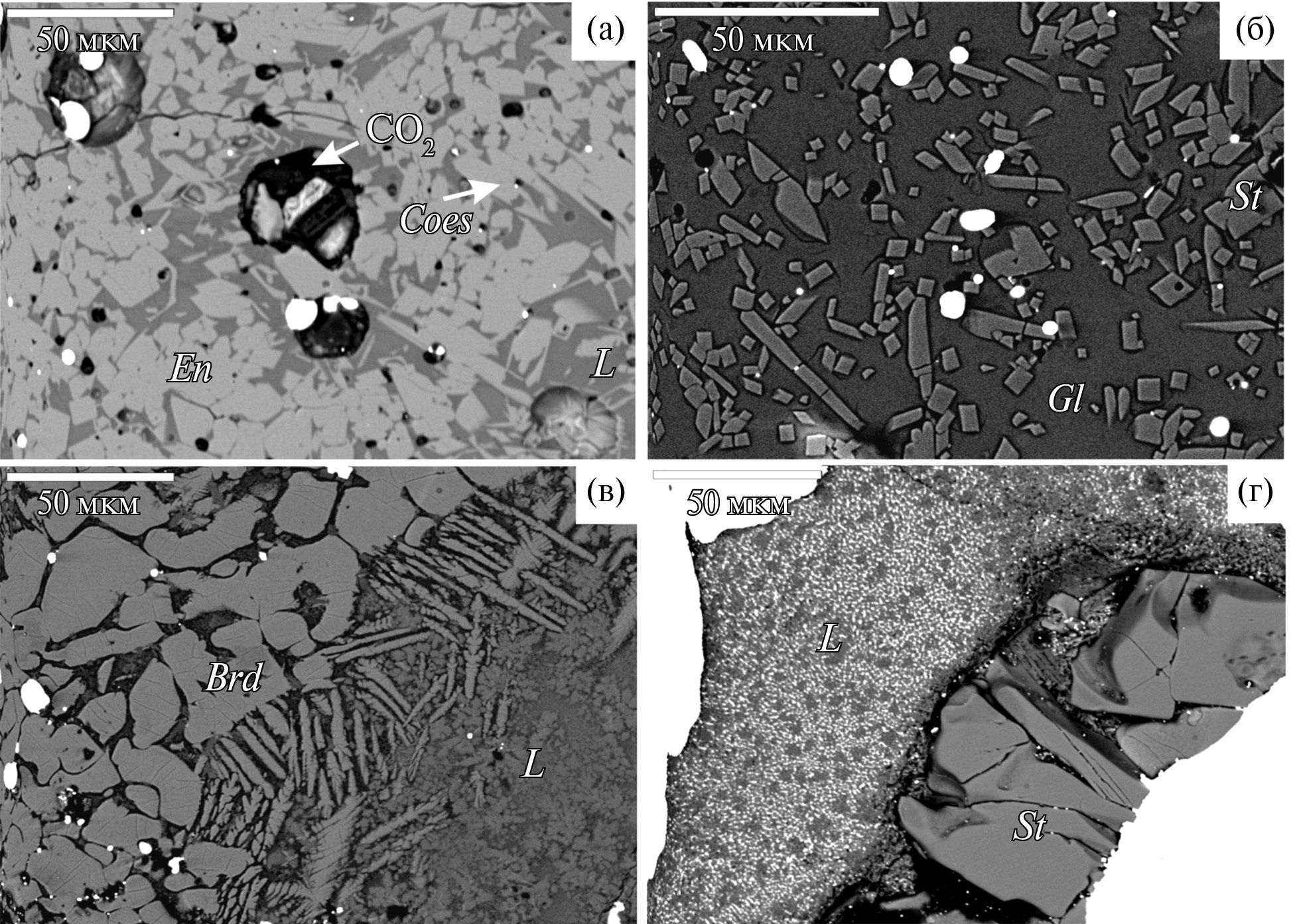 Рис. 3. Микрофотографии продуктов опытов после экспериментов в отраженных электронах: (а) Mst-2, 6.8 ГПа, 1723 K, энстатит (En) + СО2 + расплав (L); (б) Mst-5, 16.4 ГПа, 1973 K, расплав + стишовит (St), видны пустоты, свидетельствующие о выделении СО2; (в) Mst-8, 28.3 ГПа, 2173 K, бриджманит (Brd) + расплав; (г) Mst-L7, 32 ГПа, 2273 K, стишовит + расплав. Белые включения ― Pt или Au маркеры давления.