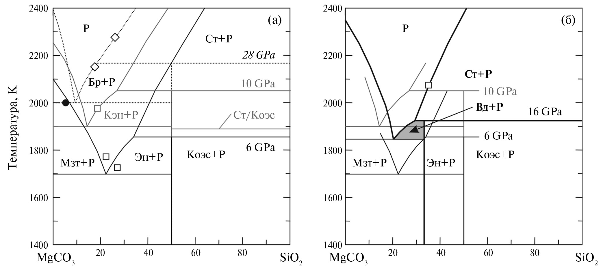 Рис. 4. Схематические фазовые диаграммы, показывающие положение эвтектики и составы расплавов в системе MgCO3−SiO2 при различных давлениях – 6, 10 и 28 ГПа (а). Отдельно вынесена диаграмма для 16 ГПа (б). Мзт ― магнезит, Р ― расплав, Эн ― энстатит, Кэн ― клиноэнстатит, Бр ― бриджманит, Коэс ― коэсит, Ст ― стишовит, Вд ― вадслеит. Черной точкой показан состав эвтектики при 26 ГПа в работе (Kakizawa et al., 2015).