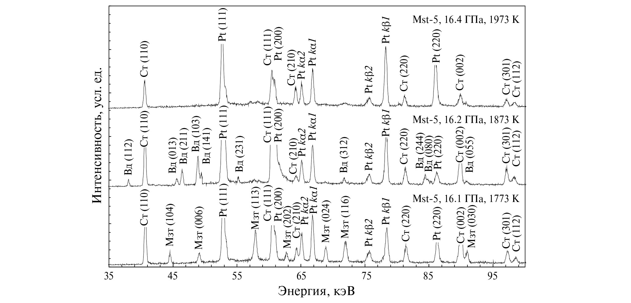 Рис. 5. Представительные рентгенограммы образца из опыта Mst-5 при 1773−1973 K. Видно исчезновение пиков магнезита (Мзт) и появление пиков вадслеита (Вд) при 1873 K и последующее исчезновение пиков вадслеита при 1973 K. Cт ― стишовит, Pt ― пики маркера давления.