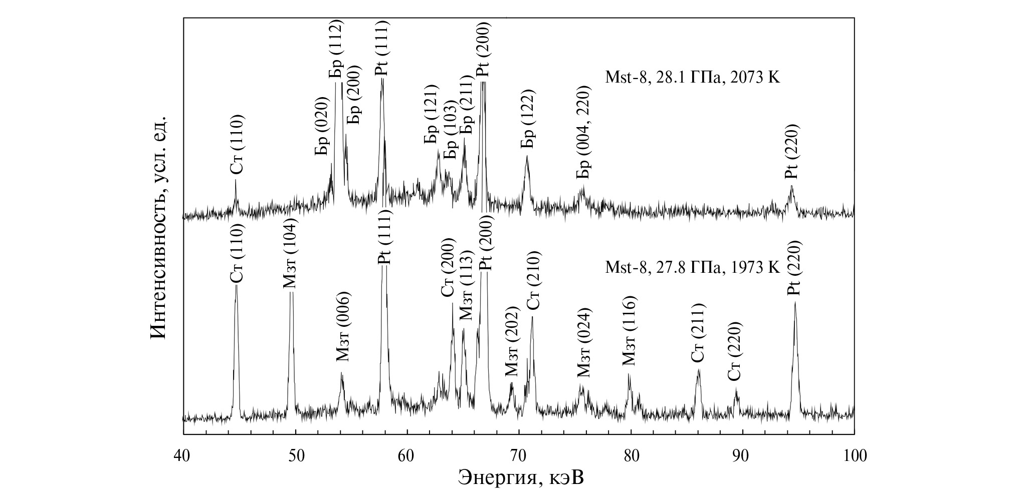 Рис. 6. Представительные рентгенограммы образца из опыта Mst-8 при 1973 и 2073 K. Видно исчезновение пиков стишовита (Ст) и магнезита (Мзт) и появление пиков бриджманита (Бр). Pt ― пики маркера давления.
