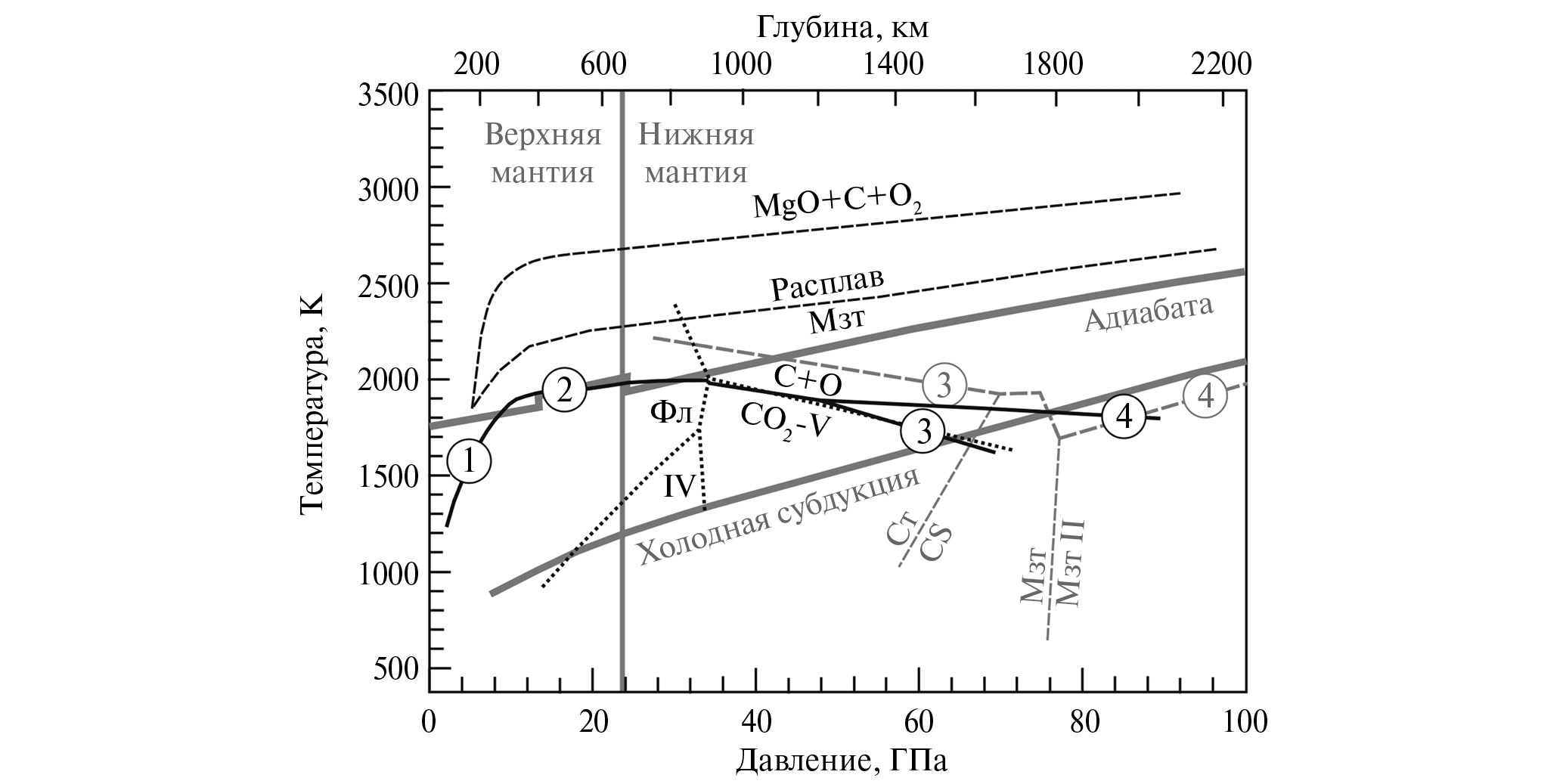 Рис. 7. Р-Т-диаграмма, показывающая положение реакции MgCO3 + CO2 на глубинах нижней мантии Земли. Черная сплошная линия ― данная работа и (Drewitt et al., 2019). Серые пунктирные линии ― (Maeda et al., 2017). 1 ― магнезит + коэсит = энстатит + CO2; 2 ― магнезит + стишовит = MgSiO3/SiO2 + расплав; 3 ― магнезит + стишовит = бриджманит + СО2-V, 4 ― MgCO3 + SiO2 = бриджманит + С + О2. Черные пунктирные линии ― плавление и разложение магнезита (Solopova et al., 2015). Черная точечная линия ― фазовые границы в системе СО2 (Litasov et al., 2011). Сплошные серые линии ― мантийная адиабата и Р-Т-профиль холодной субдукции по (Litasov, Shatskiy, 2018). Фл ― СО2-флюид, IV ― фаза СО2-IV; Ст ― стишовит, CS–SiO2 со структурой CaCl2, Мзт ― магнезит.