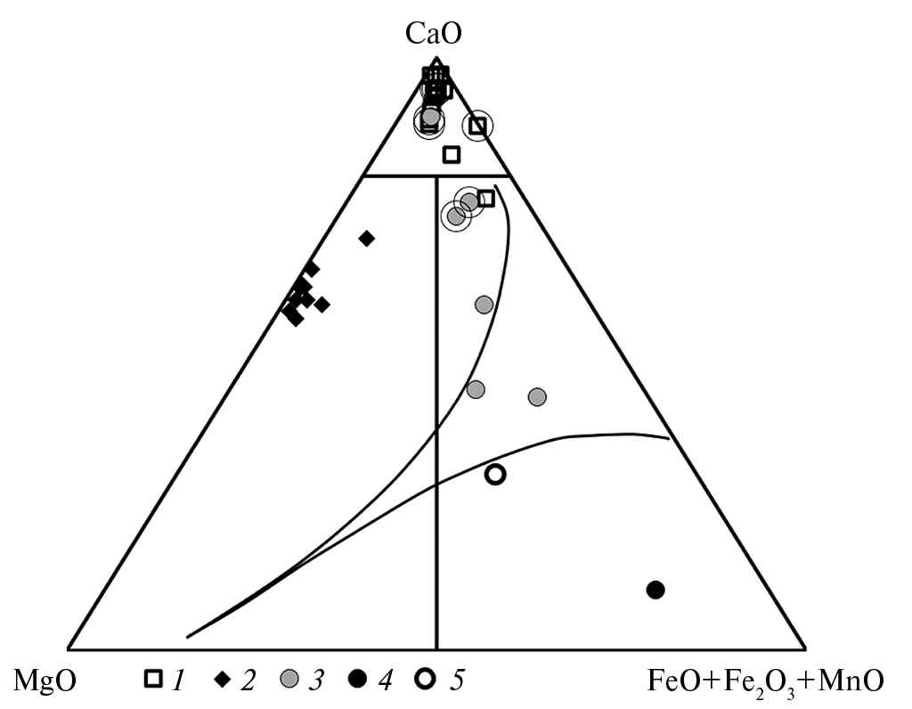 Сульфидсодержащие кальцитовые карбонатиты попадают в поле севитов (рис. 2), а два образца изученных фоскоритов ― в область железистых карбонатитов. С учетом ранее полученных данных по породам карбонатитовой серии Гулинского массива (Когарко и др., 1997) в эволюции фоскоритов отмечается ярко выраженный тренд, ведущий к росту содержания кальция и обусловленный фракционированием оливина. Положение точек составов сульфидсодержащих карбонатитов и фоскоритов в области обогащения Fe можно объяснить кристаллизацией фоскоритового расплава, в котором в ходе фракционирования оливина и кальцита в остаточной жидкости накапливался магнетит и железосодержащие сульфиды. Наши данные подтвердили общую тенденцию изменения магнезиальности и железистости пород карбонатитовой серии Гулинского массива, обнаруженную ранее (Когарко и др., 1997). Расположение составов пород карбонатитовой серии Гулинского массива вблизи составов кальцита, доломита и, по-видимому, магнетита на диаграмме MgO-CaO-FeO+Fe2O3+MnO позволяет предположить ведущую роль явлений куммуляции этих минералов в процессах дифференциации карбонатитовых расплавов.