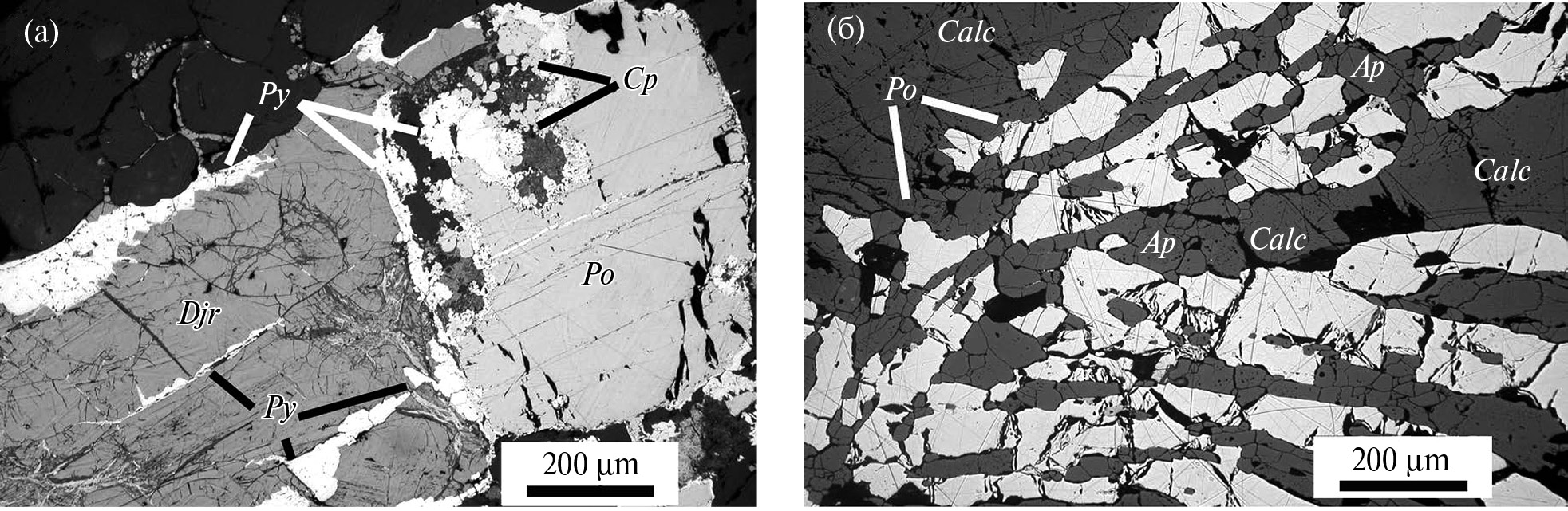 Рис. 3. Морфология выделений сульфидов: равновесная кристаллизация джерфишерита ― Djr и пирротина ― Po, замещенных пиритом ― Py и халькопиритом ― Cp, обр. 97-46; магнетит-диопсид-флогопитовый фоскорит (а); пальчатые сростки гипидиоморфных кристаллов пирротина с включениями фторапатита ― Ap в раннем кальцитовом ― Cal карбонатите, обр. 97-57 (отраженный свет) (б).