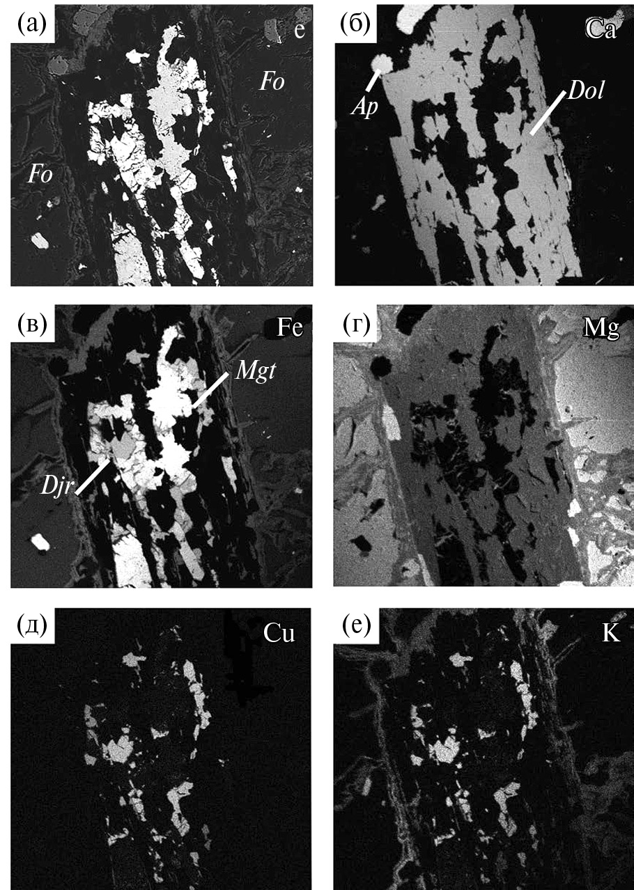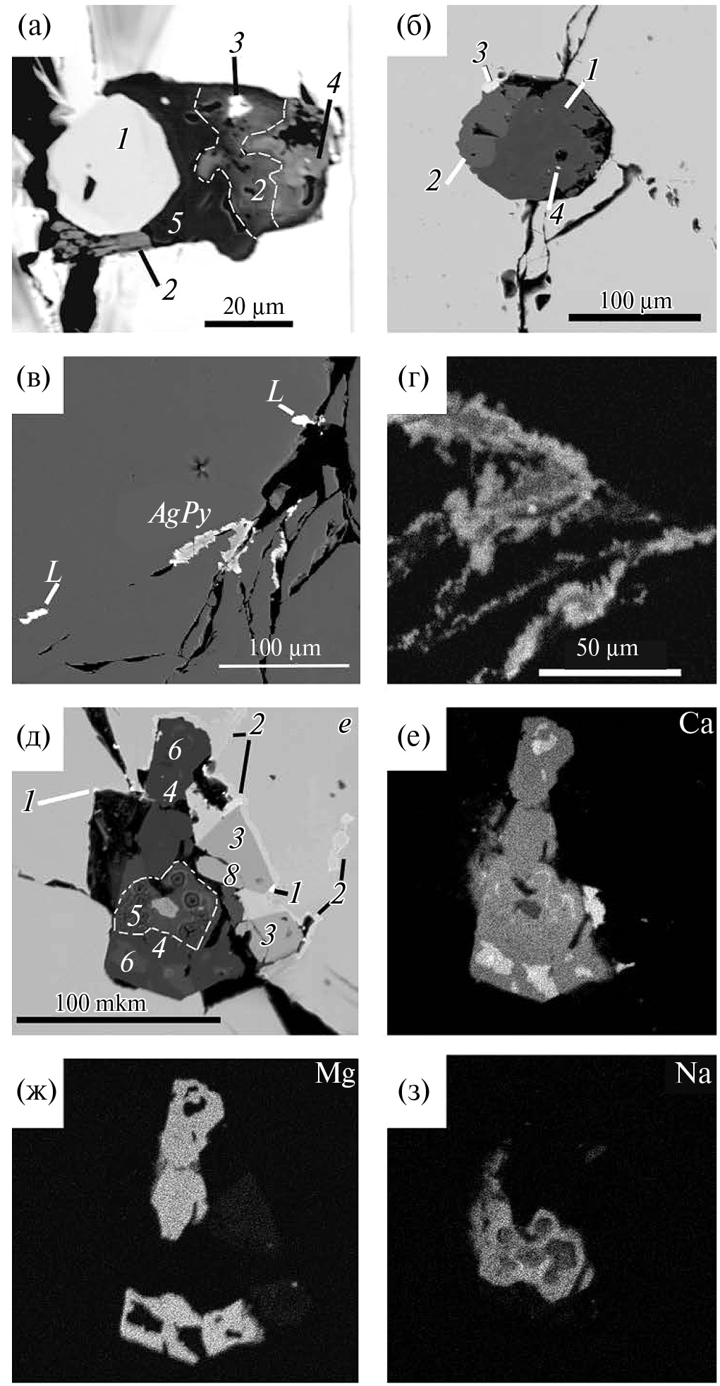 В фоскоритах, кальцитовых и кальцит-доломитовых карбонатитах минерал кристаллизуется в форме гипидиоморфных кристаллов (0.5−3 мм) и их «пальчатых» сростков в кальцит-апатитовой матрице (рис. 3). Пирротин образуется после главных минералов пород ― апатита, кальцита, форстерита, диопсида и магнетита, часто захватывая их в виде включений. На ранних стадиях пирротин образует равновесные срастания с джерфишеритом (рис. 3), на более поздних ― замещается этим минералом. В зернах раннего пирротина встречаются микронные эксолюционные включения расвумита и кобальтпентландита (рис. 4), а также флюидные включения каплевидной формы карбонат-силикатного или карбонат-магнетитового составов (рис. 5а, б), состоящие из доломита, кальцита, стронцианита, Sr-REE и K-Na-Са карбонатов, сфалерита, минералов гр. слюд. В краевой части одного из кристаллов пирротина по трещинам совместно с пиритом и халькопиритом обнаружены серебряные фазы ― ленаит, штернбергит или аргентопирит и самородное серебро (рис. 5в, г). Послойная сошлифовка одной из таких зон вскрыла полифазное включение неправильной формы (рис. 5в−е), микрозондовым методом в котором были определены магнетит, доломит, кальцит, сфалерит, K-Na-Ca карбонаты, карбоцернаит.