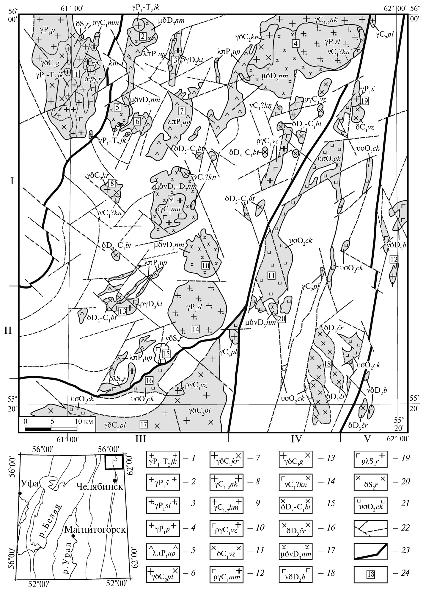 Рис. 1. Схема интрузивного магматизма листа N-41-II (составлена на основе отчета Г.В. Кальсина, ОАО “Челябинскгеосъемка”). Условные обозначения: 1–21 ― интрузивные комплексы: 1 ― югоконёвский (гранит-лейкогранитный), 2 ― шалкарский (гранитный), 3 ― султаевский (умеренно щелочно-гранитовый), 4 ― петуховский (монцодиорит-гранитовый), 5 ― урукульско-покровский (трахириолит-риолитовый), 6 ― полетаевский (гранодиорит-гранитовый), 7 ― курайский (гранодиорит-гранитовый), 8 ― некрасовский (гранодиорит-гранитовый), 9 ― каменский (гранодиорит-гранитовый), 10, 11 ― вознесенский (габбро-диорит-плагиогранитовый), 12 ― маминский (плагиогранитовый), 13 ― газетинский (гранодиорит-гранитовый), 14 ― канзафаровский (габбро-диоритовый), 15 ― биргильдинско-томинский (диоритовый), 16 ― черкасовский (диоритовый), 17 ― надыровомостовский (монцогаббро-монцодиорит-граносиенитовый), 18 ― баклановский комплекс (габбро-диорит-гранодиоритовый), 19, 20 ― рефтинский (габбро-диорит-плагиогранитовый), 21 ― чебаркульско-казбаевский (габбро-дунит-гарцбургитовый); 22 ― разрывные нарушения, 23 ― главные структуры и их номера: I ― Шилово-Конёвская антиформа, II ― Касаргино-Рефтинский синклинорий, III ― Челябинское поднятие, IV ― Айбыкульско-Копейская грабен-синклиналь, V ― Красногвардейский антиклинорий; 24 ― интрузивные массивы и их номера: 1 ― Тюбукский, 2 ― Татарско-Карабольский, 3 ― Кульмяковский, 4 ― Буринско-Карабольский, 5 ― Куяшский, 6 ― Теренкульский, 7 ― Урукульский, 8 ― Шарыкульский, 9 ― Калдинский, 10 ― Надыровомостовский, 11 ― Муслюмовский, 12 ― Ветродуйский, 13 ― Тептяргинский, 14 ― Султаевский, 15 ― Сарсангинский, 16 ― Касаргинский, 17 ― Челябинский, 18 ― Черкасовская группа массивов, 19 ― Кубагушевский, 20 ― Сураковский.