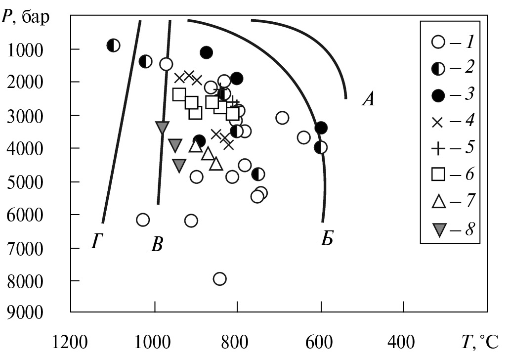 Рис. 2. Вариации температуры кристаллизации и давления флюида для гранитоидов Монголо-Охотской зоны (Коваль, Прокофьев, 1998) и пограничной области Южного и Среднего Урала. Условные обозначения: 1–3 ― фации глубинности для гранитоидов Монголо-Охотской зоны: 1 ― гипабиссальная, 2 ― гипабиссально-приповерхностная, 3 ― поверхностная; 4–8 ― гранитоидные комплексы пограничной зоны Южного и Среднего Урала: 4 ― надыровомостовский, 5 ― полетаевский, 6 ― шалкарский, 7 ― султаевский, 8 ― югоконевский. А–Г ― линии солидуса систем: А ― онгонит–H2O, Б ― гранит−H2O, В ― гранит–СО2, Г ― ‘’сухого’’ ликвидуса мусковитового гранита.