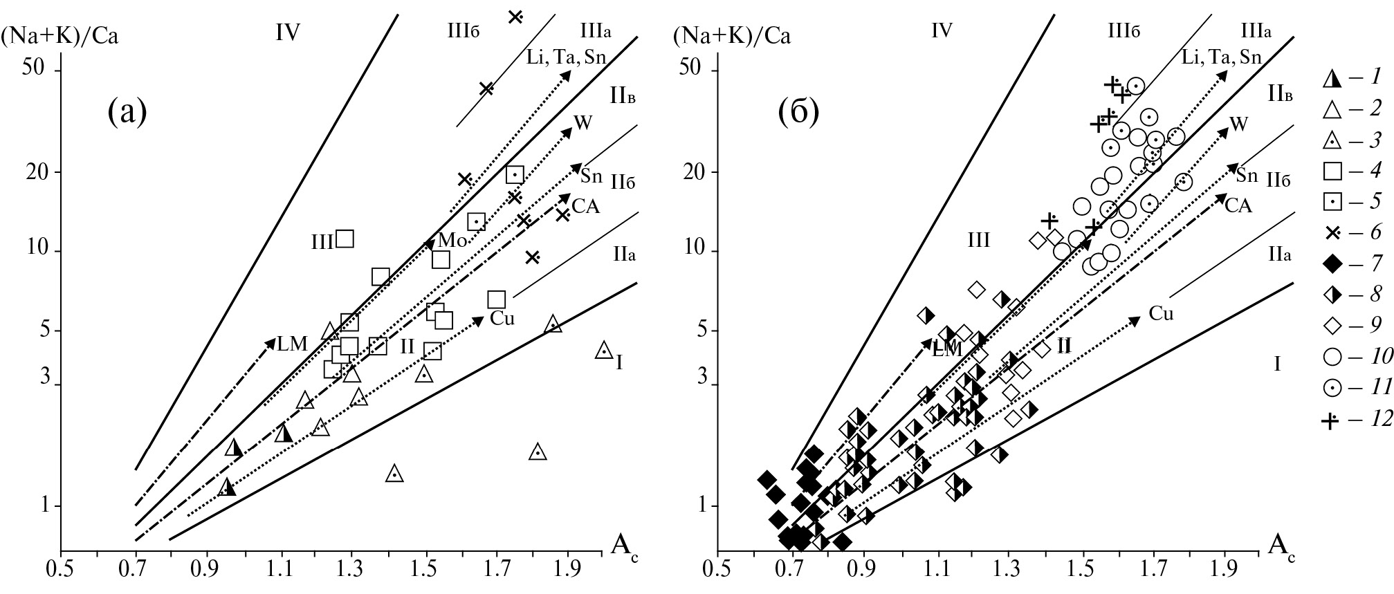 Рис. 3. Диаграмма (Na+K)/Ca ― Ac для интрузивных комплексов Кунашакской площади с эталонными трендами рудогенных гранитоидных формаций (Бородин, 2004). Условные обозначения: 1–6 (для рис. 3а), в том числе: 1–3 ― рефтинский комплекс (габбро имеют параметр (Na+K)/Ca около 0.2 ед. и на рис. 3а не представлены): 1 ― кварцевые диориты, 2 ― тоналиты, 3 ― плагиограниты; 4-5 ― полетаевский комплекс: 4 ― граниты, гранодиориты, 5 ― жильные граниты; 6 ― шалкарский комплекс, граниты; 7–12 (для рис. 3б), в том числе: 7–9 ― надыровомостовский комплекс: 7 ― габбро, монцогаббро, 8 ― монцодиориты, сиениты, граносиениты, 9 ― гранодиориты; 10–11 ― султаевский комплекс: 10 ― граниты, 11 ― жильные граниты; 12 ― югоконевский комплекс, граниты. Классификационные поля: I ― известковое, II ― известково-щелочное (IIа ― субизвестковистые, II6 ― известково-щелочные, IIв ― субизвестково-щелочные граниты); III ― субщелочное (IIIа ― субщелочные и щелочные граниты и лейкограниты, IIIб ― щелочные агпаитовые граниты); IV ― щелочное. Эталонные тренды (штрих-пунктирные линии): СА ― главный известково-щелочной, LM ― латитовый (монцонитовый). Эталонные тренды рудогенных гранитоидных формаций (пунктирные линии): Sn ― оловянный, Cu ― медно-порфировый, Mo-(Cu) ― молибденовый, W-(Mo) ― вольфрам-молибденовый; Li, Ta, Nb, Sn ― литий-тантал-ниобий-оловянный.