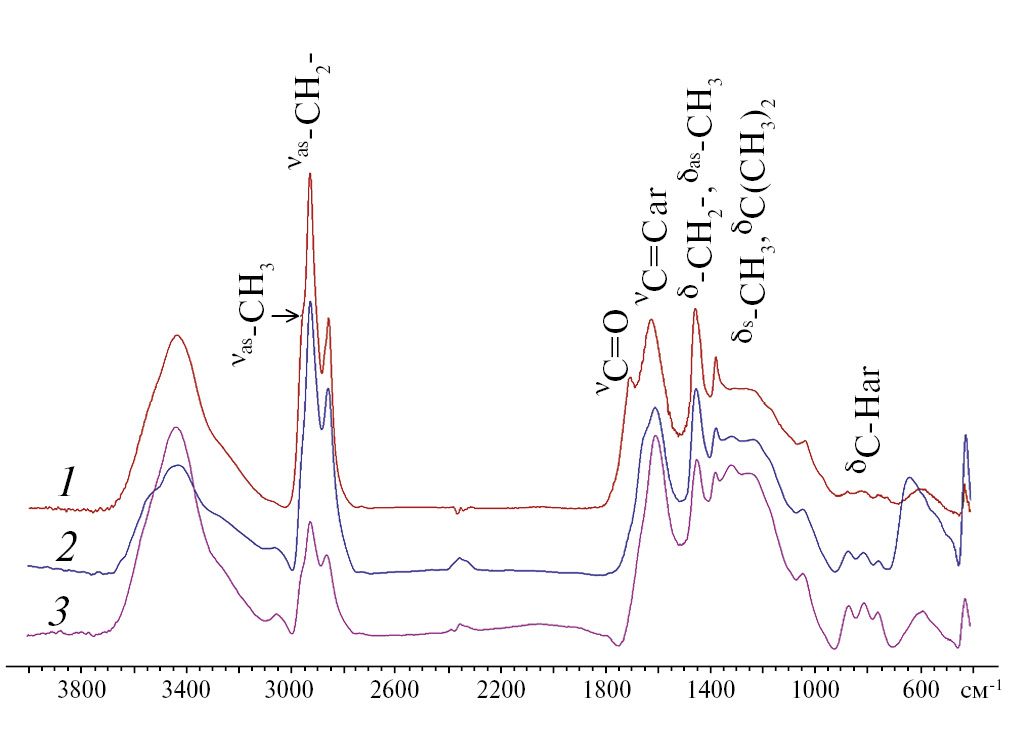 Рис. 1. ИК-спектр керогенов, выделенных из пород доманика, отличающихся по градации природного катагенеза. 1 – Чуть-устье (Tmax 413 °C), 2 – 250-Восточный Возей (Tmax 444 °C), 3 – 12-Командиршор-4,6 (Tmax 462 °C). Произведена корректировка базовой линии. ν – валентные колебания, δ – деформационные колебания, as – асимметричные, ar – ароматические.
