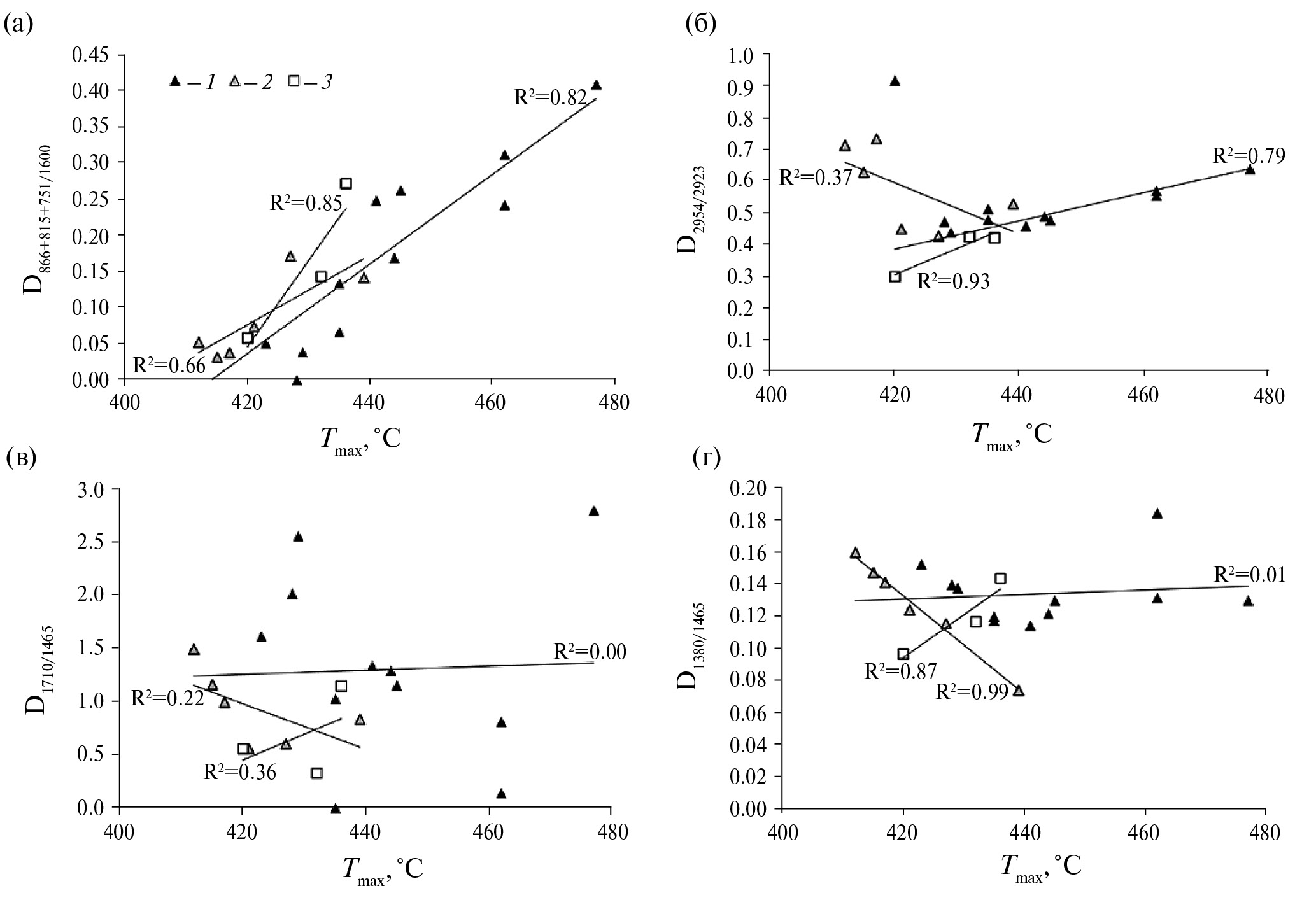 В качестве показателя, отвечающего за термическую зрелость органического вещества, нами выбран показатель Tmax, получаемый в пиролизе Rock-Eval. Интервал изменений этого показателя в изученной выборке пород составляет 412–474 °С. Это отвечает изменениям от незрелого до постзрелого органического вещества (Peters, Cassa, 1994). В случае исследованных нами керогенов верхнедевонских доманикитов и доманикоидов, как отличающихся по градациям природного катагенеза, так и с искусственно повышенной стадией термической зрелости —наилучшим образом коррелирует с величиной Tmax отношение D870+820+750/D1600, которое отражает соотношение между деформационными колебаниями Сар-Н и валентными колебаниями C=C ароматических ядер (рис. 2а). Соотношение групп –СН3 к –СН2–, оцениваемое нами по величине отношения D2954/D2923, характерных для валентных асимметричных колебаний этих групп, в целом возрастает для выборки керогенов, отличающихся по природному катагенезу, а также для искусственно преобразованных образцов из разреза Шарью. При этом для керогенов невысоких стадий термической зрелости оказались характерными повышенные, не укладывающиеся в основной тренд значения (рис. 2б). Данное соотношение имеет отличную корреляцию с длиной углеводородной цепи в случае индивидуальных н-алканов (Lin, Ritz, 1993). Некоторое снижение обратного применяемому нами коэффициента СН2/СН3, также рассчитанного по интенсивностям асимметричных валентных колебаний, характерно для серии девонских черных сланцев Северной Америки (Lis et al., 2005). Отношение D1710/D1465, известное как коэффициент О (Глебовская, 1971) или условное содержание кислородсодержащих групп, не показывает выраженного тренда ни для естественной серии керогенов, ни для искусственно преобразованных в автоклаве (рис. 2в). Величина D1380/D1465, известная как Р, или коэффициент разветвленности (Глебовская, 1971), отражает соотношение между деформационными колебаниями групп С(СН3)2 и –СН2–, то есть метильных групп в гем- положении по отношению к алкильным цепям. Поведение этого коэффициента в наших выборках интересное (рис. 2г). Для серии керогенов природного катагенеза какая-либо зависимость Р от Тмакс отсутствует, для серии образцов, полученных гидротермальной обработкой сланца из разреза р. Чуть, присутствует отрицательная корреляция с очень высоким значением R2, а для термически преобразованных образцов из разреза р. Шарью корреляция положительная. Отметим, что необычное поведение метильных групп по данным ИК-спектров фиксировалось для исходного образца р. Чуть по коэффициенту D2954/D2923, имеющему здесь аномальное значение.