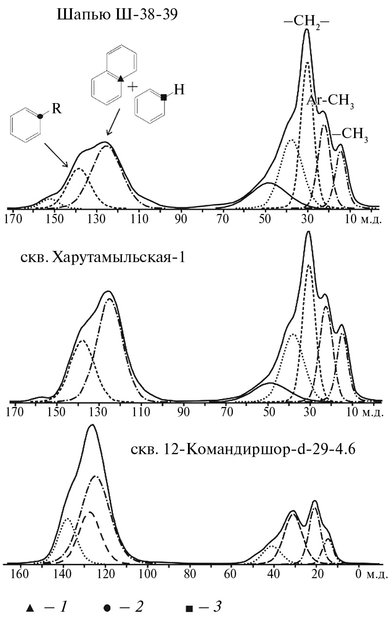 Рис. 3. 13С ЯМР-спектры керогена доманиковых отложений различных градаций катагенеза после деконволюции: 1 – межциклический углерод; 2 – замещенный углерод; 3 – протонированный углерод