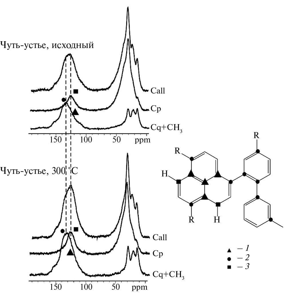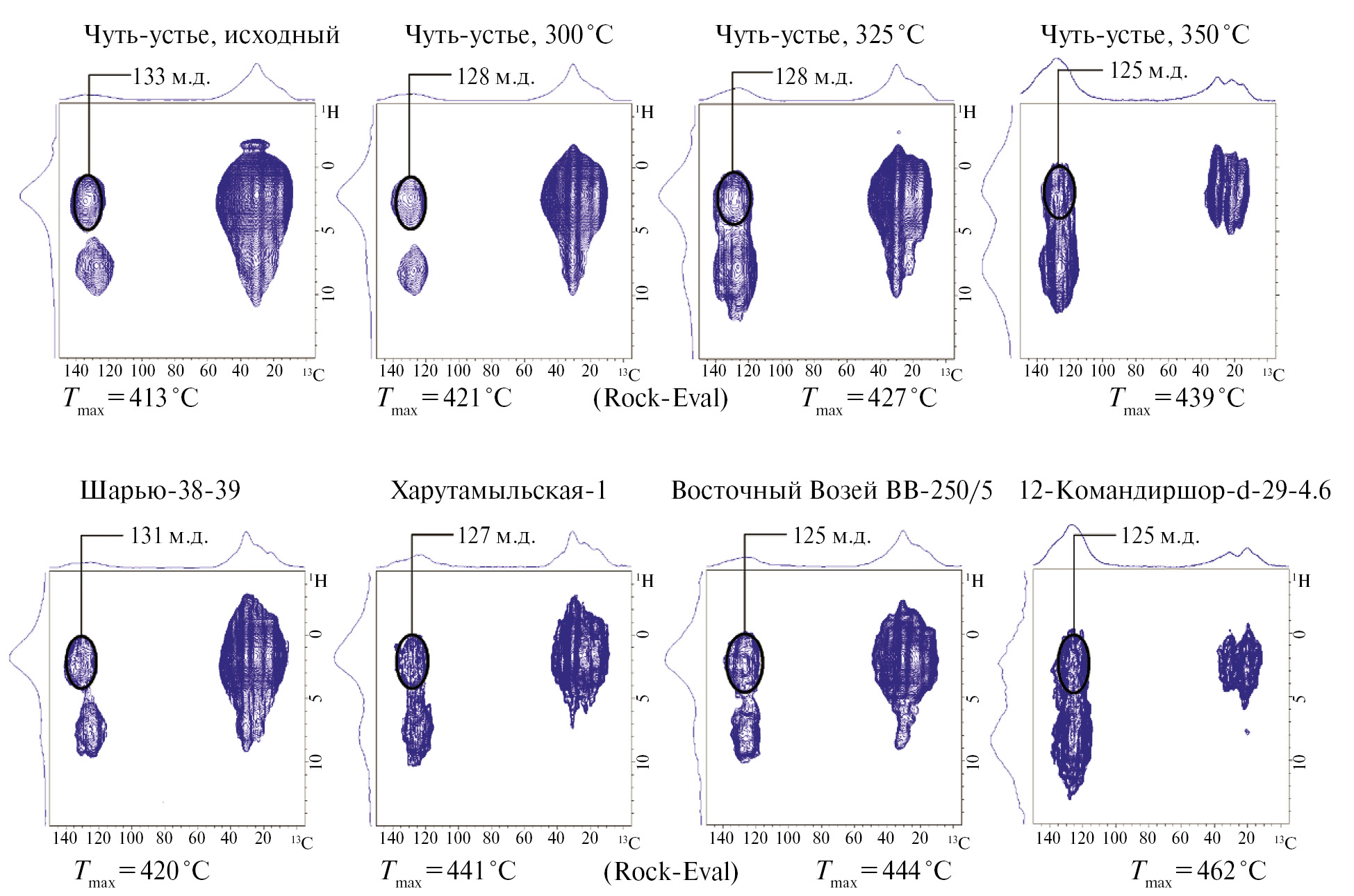 Природа смещения кросс-пика между ароматическим углеродом и алифатическим водородом хорошо иллюстрируется на срезах спектров 1Н–13С HETCOR на уровне максимума этого пика по 1H. Изменения химического сдвига здесь связаны с перераспределением интенсивностей пиков, относящихся к замещенному алкильными цепями ароматическому углероду в сторону межциклического углерода (Mao et al., 2010). Важно указать, что скорость этого процесса, относительно изменений значения Tmax, для естественного катагенеза и его автоклавного моделирования не эквивалентны (Бурдельная и др., 2015). Очевидно, что перестройка ароматической структуры керогена в условиях модельного эксперимента происходит быстрее по сравнению с природным катагенезом в шкале значений Tmax по пиролизу Rock-Eval.