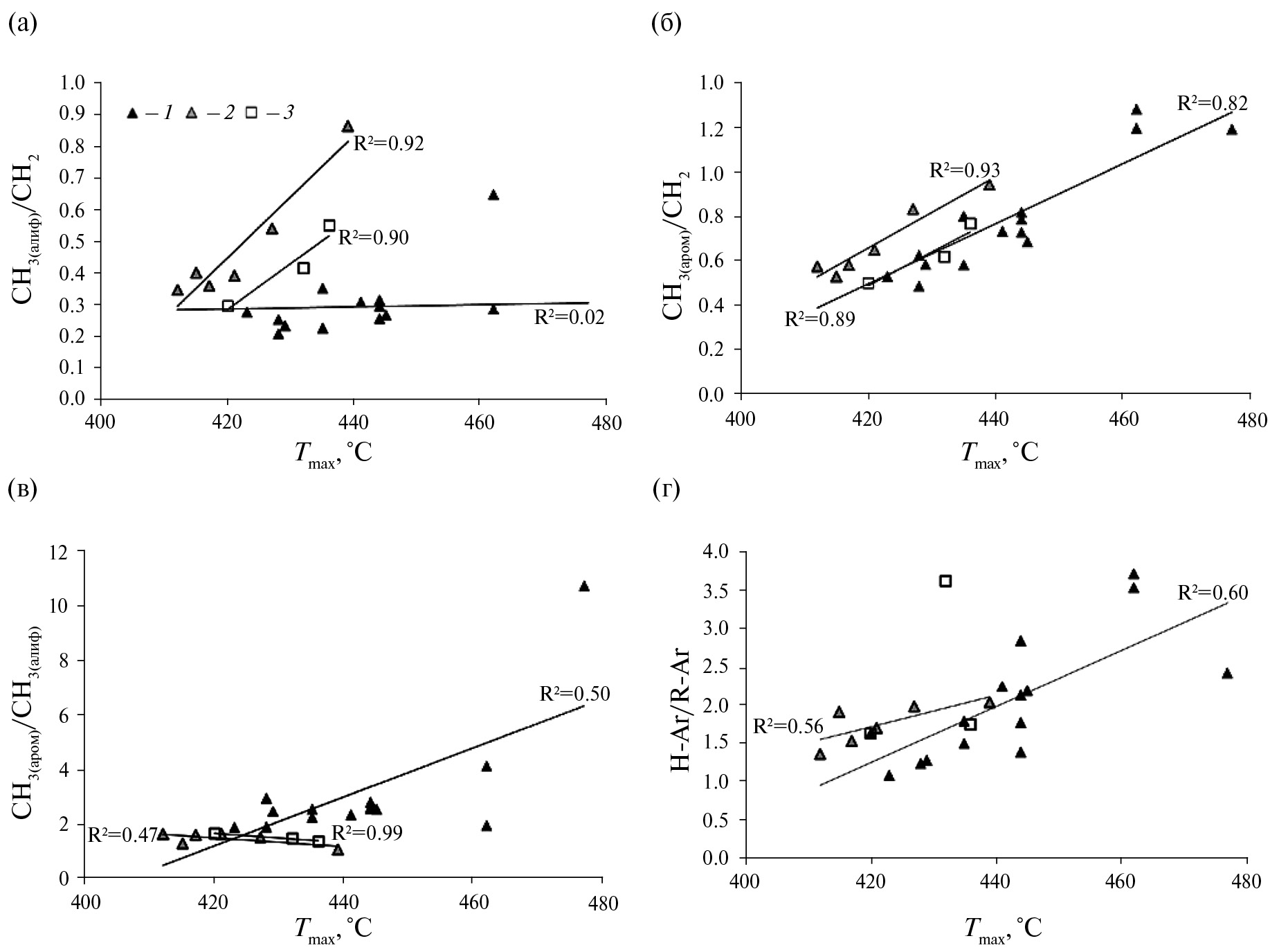Из графиков, представленных на рис. 5а-в, следует, что отношение –СН3(алиф)/–СН2– не зависит от зрелости органического вещества при природном катагенезе. Для отношений – СН3(аром)/–СН2– и –СН3(аром)/–СН3(алиф) характерно нарастание с катагенезом, то есть изменение соотношения между содержанием в керогене метильных групп и алифатических цепей, наблюдавшееся в разных объектах, по данным, прежде всего, ИК-спектроскопии (Lis et al., 2005), должно объясняться не изменением длины алифатических цепочек, а преимущественным их элиминированием из керогена при остаточном накоплении метильных групп, связанных с ароматическими ядрами.