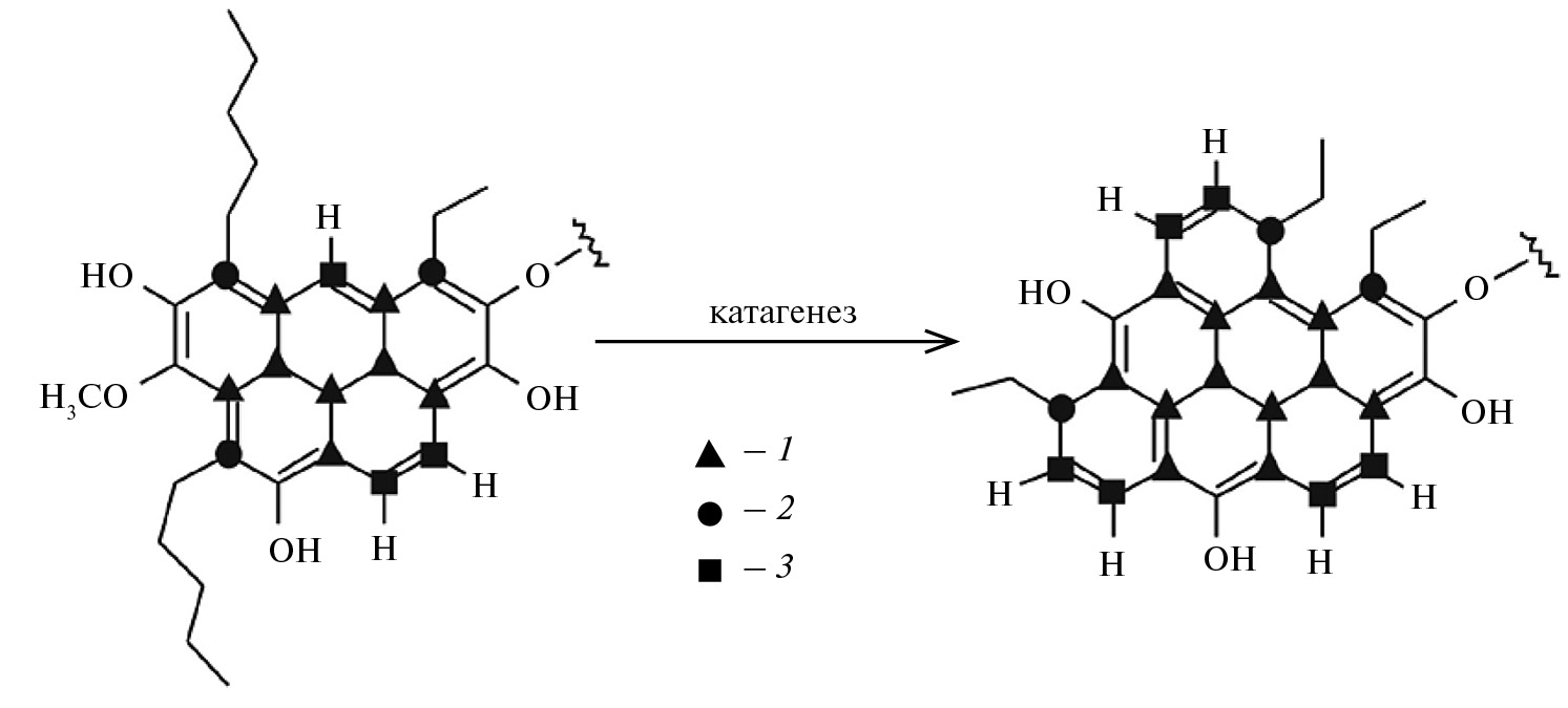 Рис. 6. Схема преобразования ароматической структуры керогена в процессе катагенеза. Усл. обознач.: 1, 2, 3 – см. рис. 3.