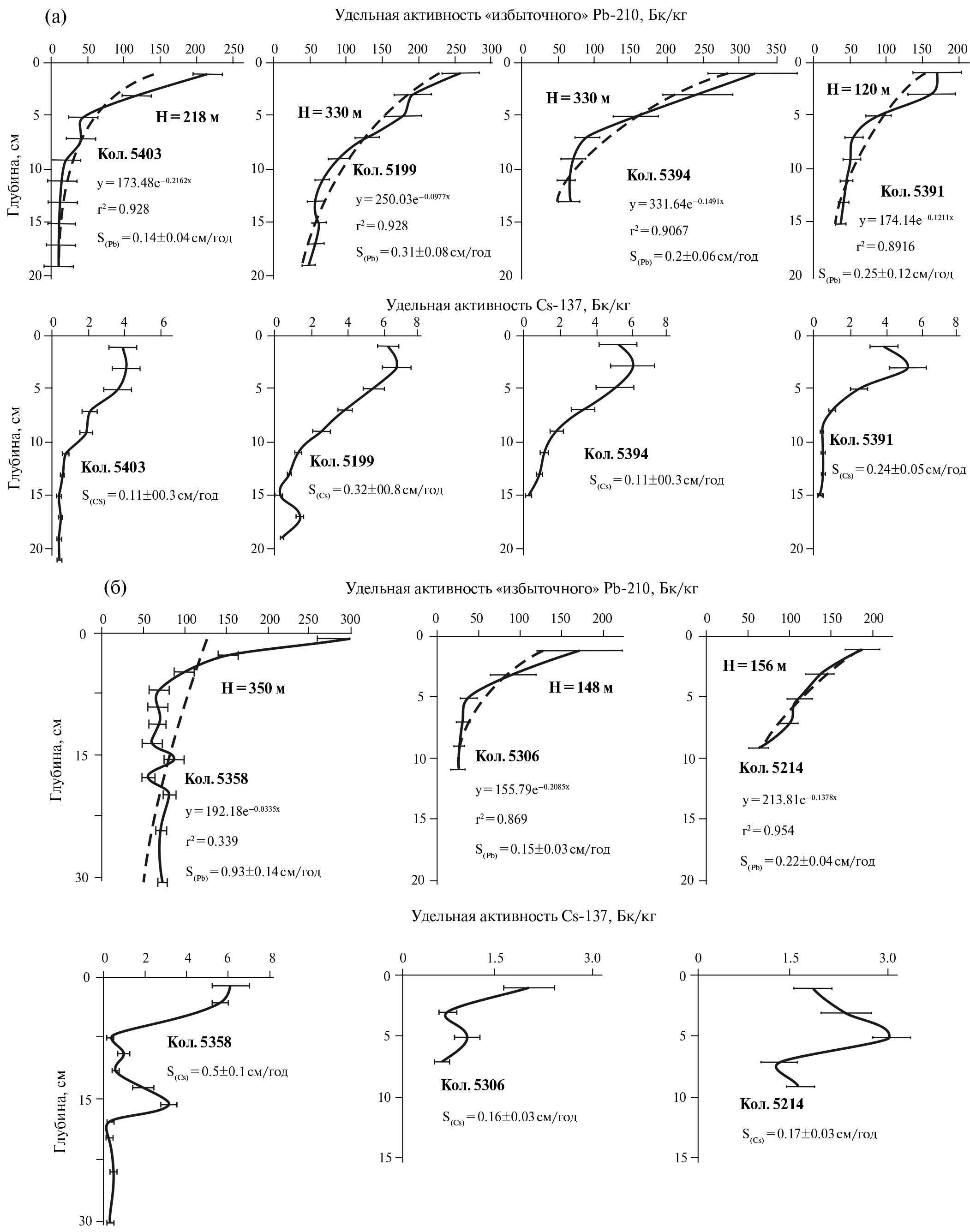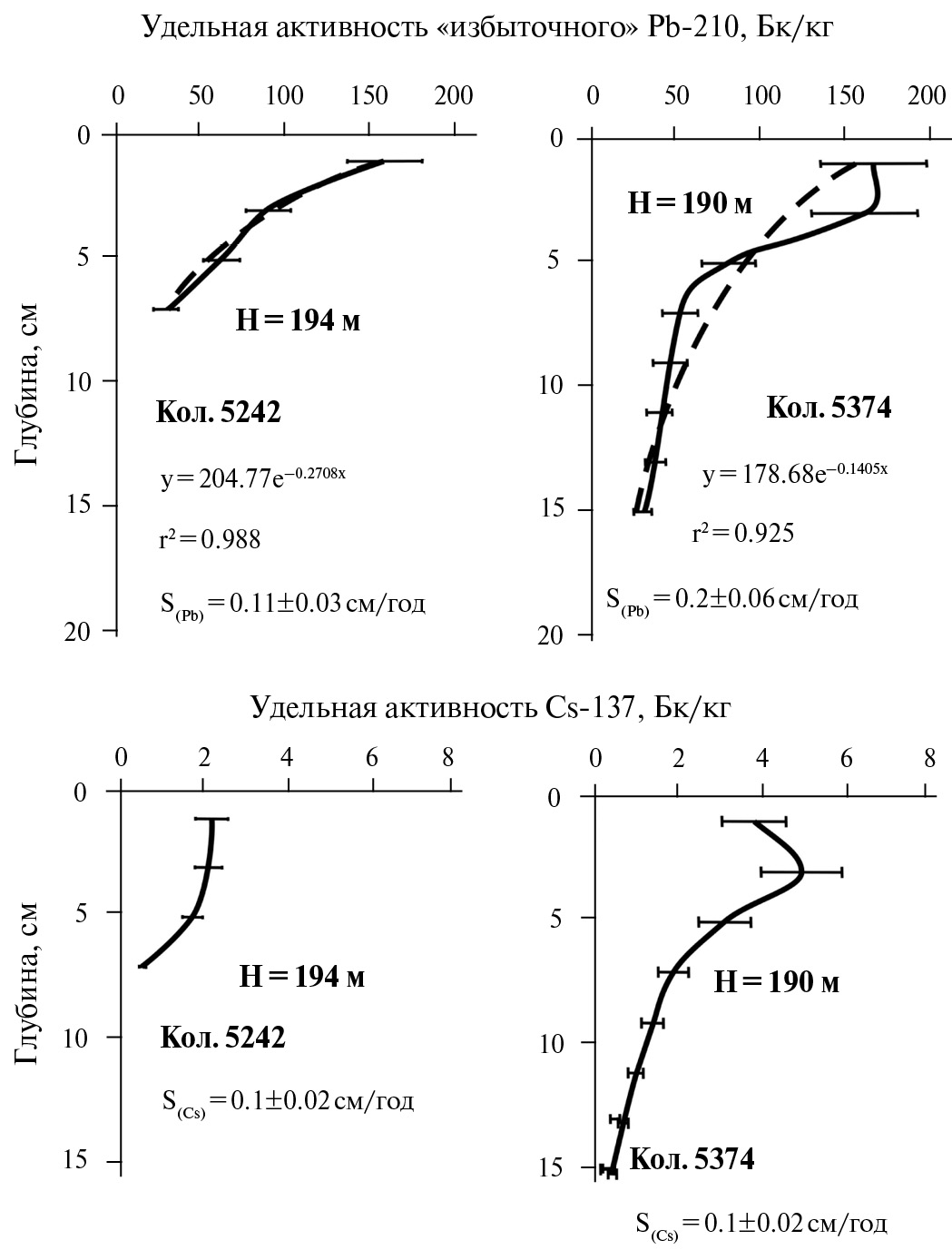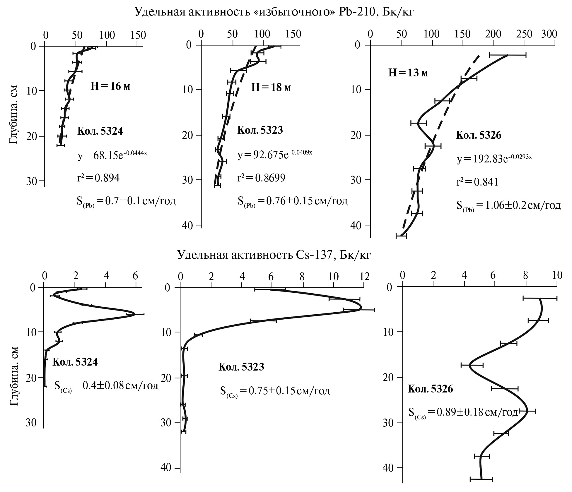 На рисунках 2–5 показаны профили распределения “избыточного” 210Pb в отобранных колонках. Величину «избыточного» свинца-210 определяли путем вычитания удельной радиоактивности радия-226 из исходного «суммарного» содержания свинца-210 в соответствующем горизонте колонки. Полученное значение отражает седиментационное поступление свинца-210 из атмосферы, дополнительно к его содержанию в пробах разреза, образованному за счет радиоактивного распада радия-226 (Galdberg, 1963; Купцов, 1986; Сапожников и др., 2006). В наиболее благоприятном случае, когда скорость осадконакопления постоянна, а перемешивание незначительно, содержание «избыточного» свинца-210 должно экспоненциально убывать вглубь колонки вплоть до горизонтов, где оно становится равным активности радия-226, отражая так называемое «вековое» равновесие этих двух радионуклидов. При таких условиях параметры аппроксимирующей экспоненты служат основанием для расчета скорости осадконакопления. В нашем случае вертикальное распределение “избыточного” свинца-210 в измеренных колонках имело достаточно монотонный характер и удовлетворительно описывалось экспоненциальной зависимостью с коэффициентами корреляции r2 – от 0.6 до 0.9: