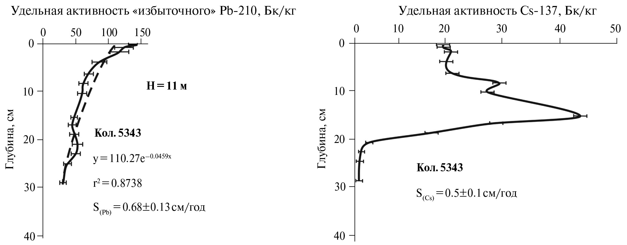 В колонке зафиксированы максимально высокие пики активности “избыточного” 210Pb. Так, в верхнем слое 0–5 см активность достигла более 200 Бк/кг (таблица, рис. 2). Ниже по разрезу активность снижается по кривой, близкой к усредненной экспоненте с коэффициентом корреляции 0.84, достигая значений 53 Бк/кг на глубине 40–45 см. Эта кривая позволяет установить среднюю для колонки скорость седиментации S(Pb) = 1.06 см/год, т.е. максимально высокую для всех измеренных нами колонок. В то же время, вертикальное распределение активности 137Cs имеет только один четко выраженный подповерхностный максимум в слое 25–30 см. Исходя из возрастной модели, полученной по 210Pb, этот пик активности 137Cs отражает глобальное выпадение 1986 г. в результате аварии на Чернобыльской АЭС. Если за основу реконструкции принять последнюю дату, то скорость седиментации составит S(Cs) = 0.89 см/ год (рис. 2). Таким образом, в основании колонки на глубине 50 см находится осадок возрастом около 47–56 лет.
