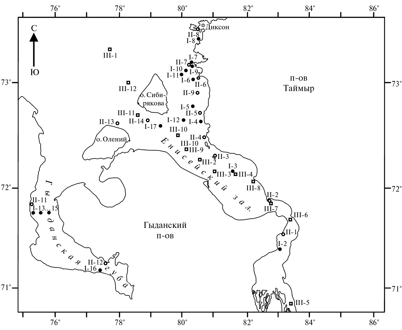 Рис. 1. Расположение станций отбора проб в эстуарии Енисея и на прилегающей акватории в 2009 (I-№), 2010 (II-№) и 2016 (III-№) гг.