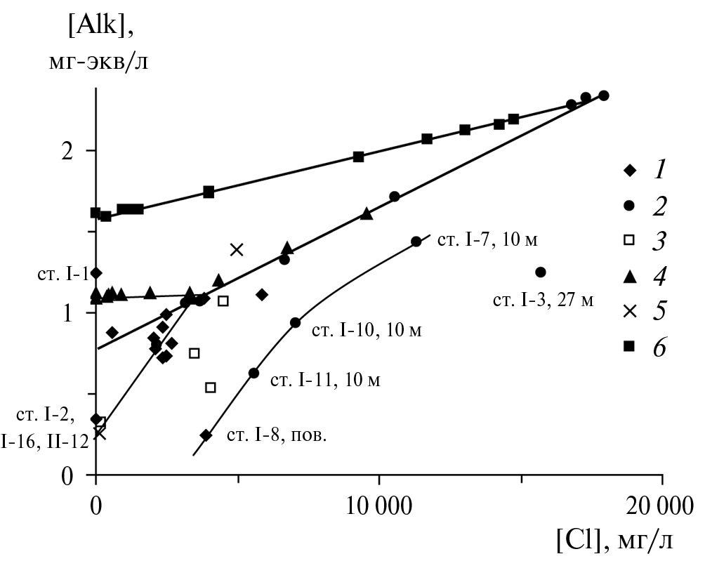[Alk, мг-экв/л] = 0.77 + 8.77 × 10–5[Cl, мг/л], r = 0.994 , (2)
