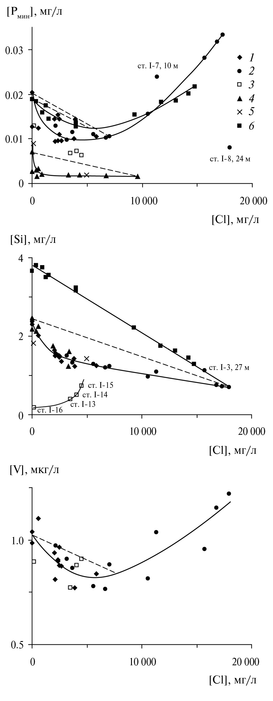 Таким образом, отличительной чертой миграции фосфатов, кремния и ванадия в эстуарии Енисея является неконсервативное поведение, обусловленное их участием в продукционно-деструкционных процессах. Потери этих элементов в вегетационный период достигают соответственно 30–57, 30 и 9% их поступления с речным стоком при содержании хлоридов 1.0–2.5, 2.0–3.0 и 3.0–3.5 г/л, тогда как в период зимней межени влияние биологических процессов на распределение элементов этой группы незначительно.