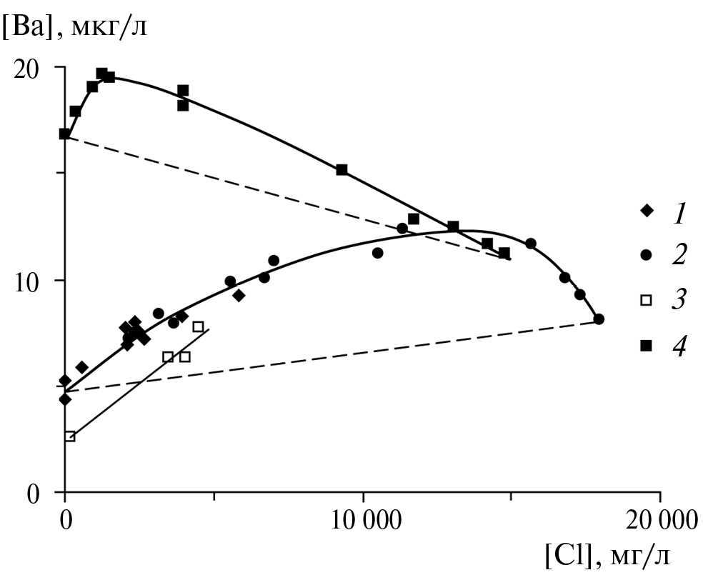 Так, для бария на протяжении всей зоны смешения речных и морских вод характерно дополнительное поступление в раствор за счет реакций ионного обмена в поглощенном комплексе речных взвесей (рис. 4). Десорбция бария происходит как при более низком, так и при более высоком его содержании в енисейских водах по сравнению с таковым в морской водной массе, что, однако, отражается на абсолютной величине максимального избытка растворенных форм и соответствующей ему солености. В летне-осенний паводочный период 2009 г. количество десорбируемого бария (5.1 мкг/л) было сопоставимо с его концентрацией в речных водах (4.8 мкг/л) и достигало максимума при содержании хлоридов 10–13 г/л, тогда как при повышенной концентрации бария в меженном стоке 2016 г. (16.8 мкг/л) вклад десорбции в его суммарный вынос в океан был менее значим: наибольшее поступление бария составило 3.3 мкг/л, или 20% содержания в речных водах, и было зафиксировано при хлорности 1.3 г/л.