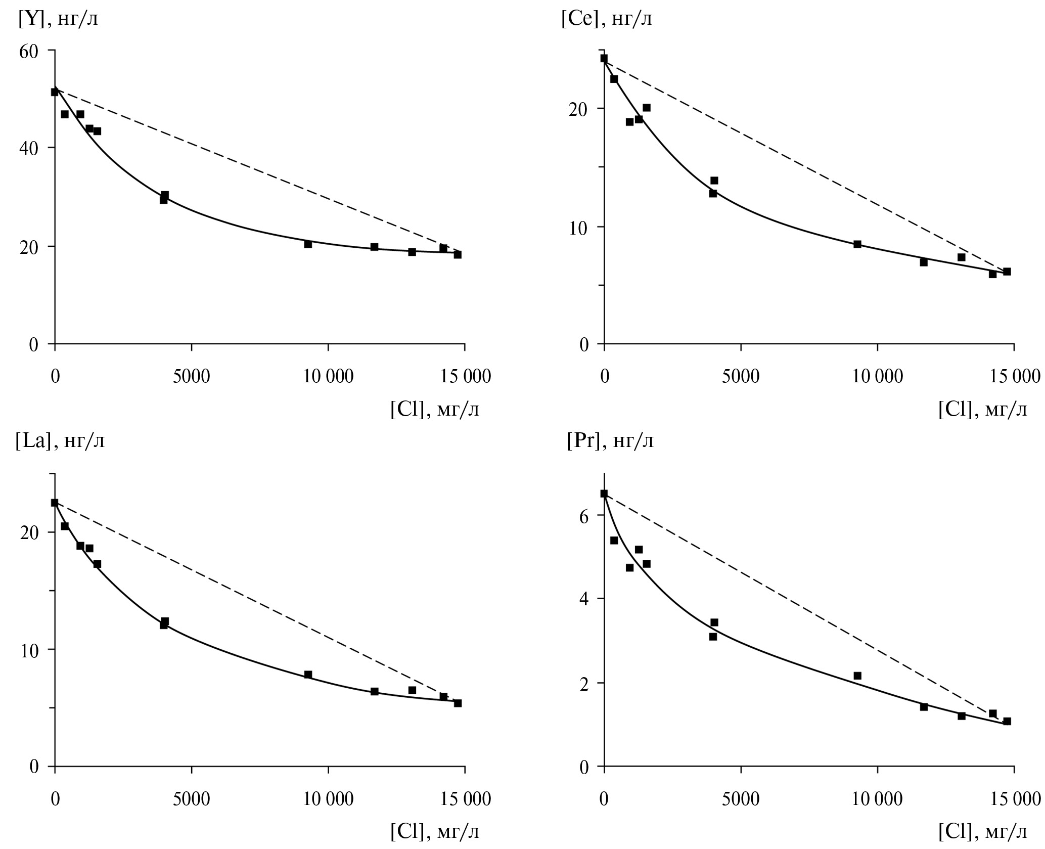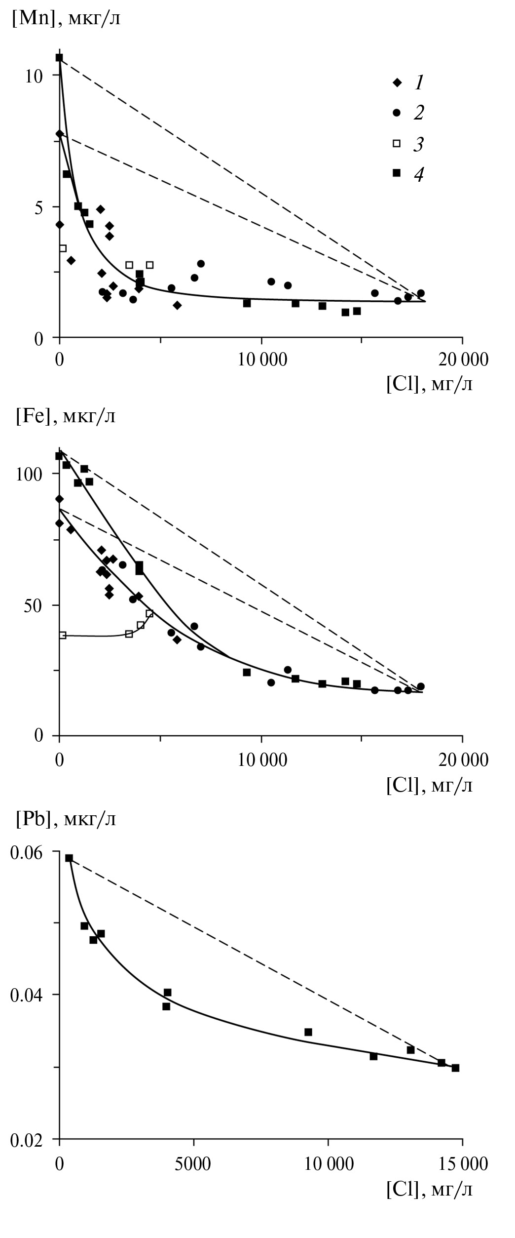 Концентрации растворенных форм тяжелых металлов (Mn, Fe, Pb) и элементов-гидролизатов (Al, Ti, Y, La, Ce, Pr), которые присутствуют в природных водах, помимо истинно растворенного состояния, в виде органических и органо-минеральных коллоидов, резко снижались в области низкой и средней солености (рис. 5–7), главным образом в результате коагуляции и флоккуляции коллоидной фракции, контролирующей миграцию этих элементов в большинстве устьевых областей рек мира (Гордеев, 2012). При дальнейшем возрастании солености происходило замедление снижения концентраций и асимптотическое приближение к характеристикам морской водной массы. Максимальные потери марганца, железа и алюминия составили 4.2–6.5, 24–35 и 5.1 мкг/л (54–61, 28–34 и 32% их концентраций в енисейских водах) при содержании хлоридов от 3.0 до 8.5 г/л, тогда как удаление из раствора свинца, титана, иттрия, лантана, церия и празеодима было несколько меньше и достигало соответственно 11.8, 106, 13.5, 5.8, 6.2 и 1.7 нг/л (20–26% содержания в речном стоке) в том же диапазоне хлорности. Можно предположить, что изменчивость химического состава речного стока играет в распределении элементов этой группы подчиненную роль, о чем свидетельствует близость формы зависимостей концентраций растворенных железа и марганца от содержания хлоридов в 2009 и 2016 гг.