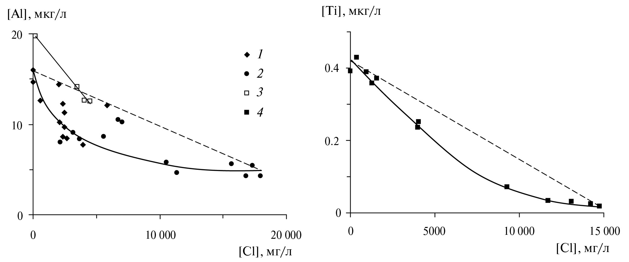 Рис. 6. Распределение растворенных форм алюминия и титана в эстуарии Енисея и на прилегающей акватории. 1 – эстуарий Енисея, 2009 г., поверхностный слой; 2 – то же, промежуточный и придонный горизонты; 3 – Гыданская губа, 2009 г., поверхностный слой; 4 – эстуарий Енисея, 2016 г., поверхностный слой.