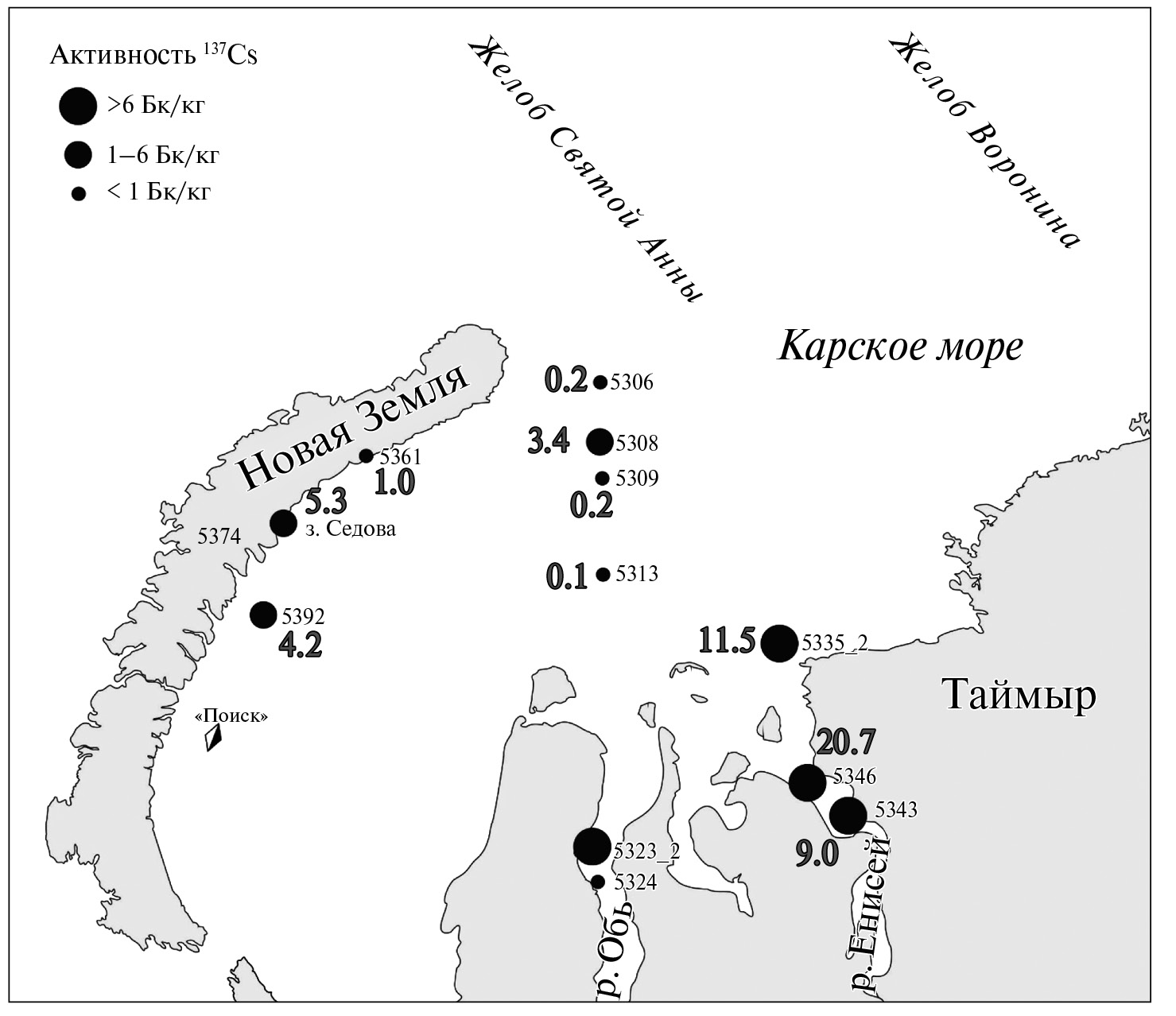 Поверхностные осадки в заливе Седова на станции 5374 (рис. 1) представлены жидкими неконсолидированными зеленовато-черными алевритово-пелитовыми илами с редкими крупными обломками плохо окатанных глинистых сланцев и алевролитов. Активность 137Cs – 5.3 Бк/кг, 90Sr – менее 0.5 Бк/кг. Количество органического углерода – 1.5%.