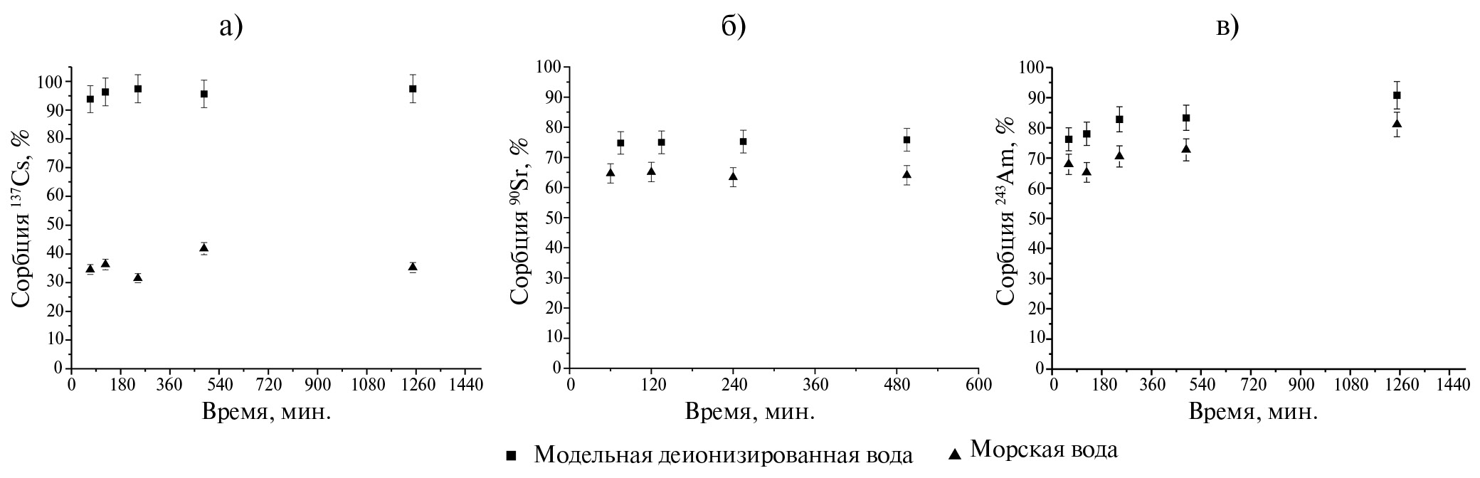 Коэффициенты сорбции (Kd) изучаемых радионуклидов составляют: 137Cs из морской воды 61.6, из модельной деионизированной воды 3404; 90Sr из морской воды 236, из модельной деонизированной воды от 200 до 600; 241Am из морской воды 4187.