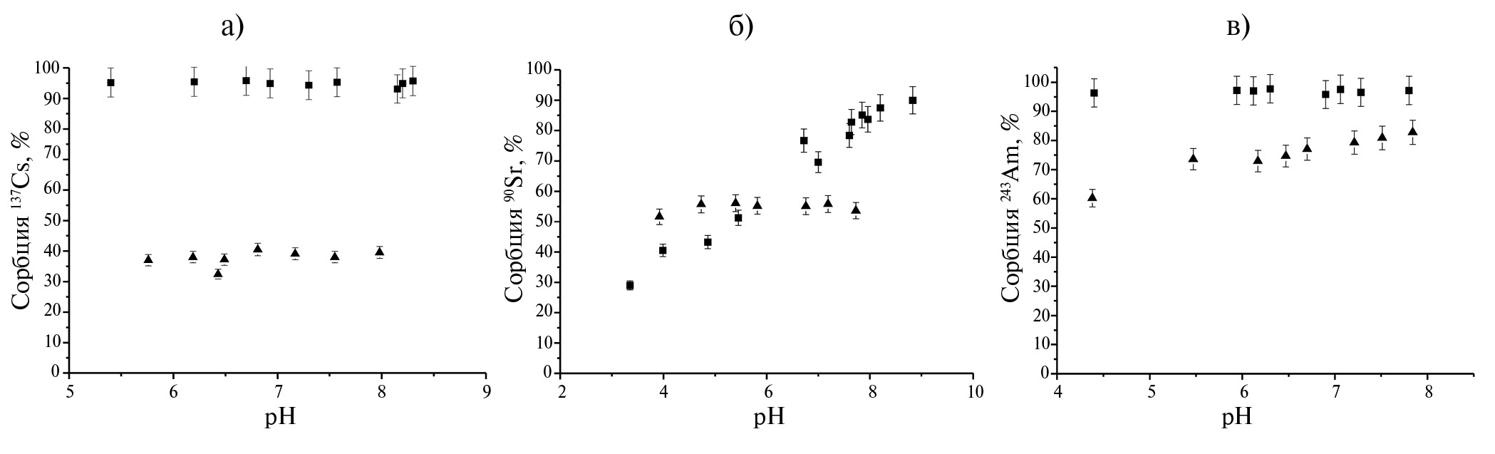 Рис. 3. Зависимость сорбции Cs (а), Sr (б) и Am (в) от величины pH.