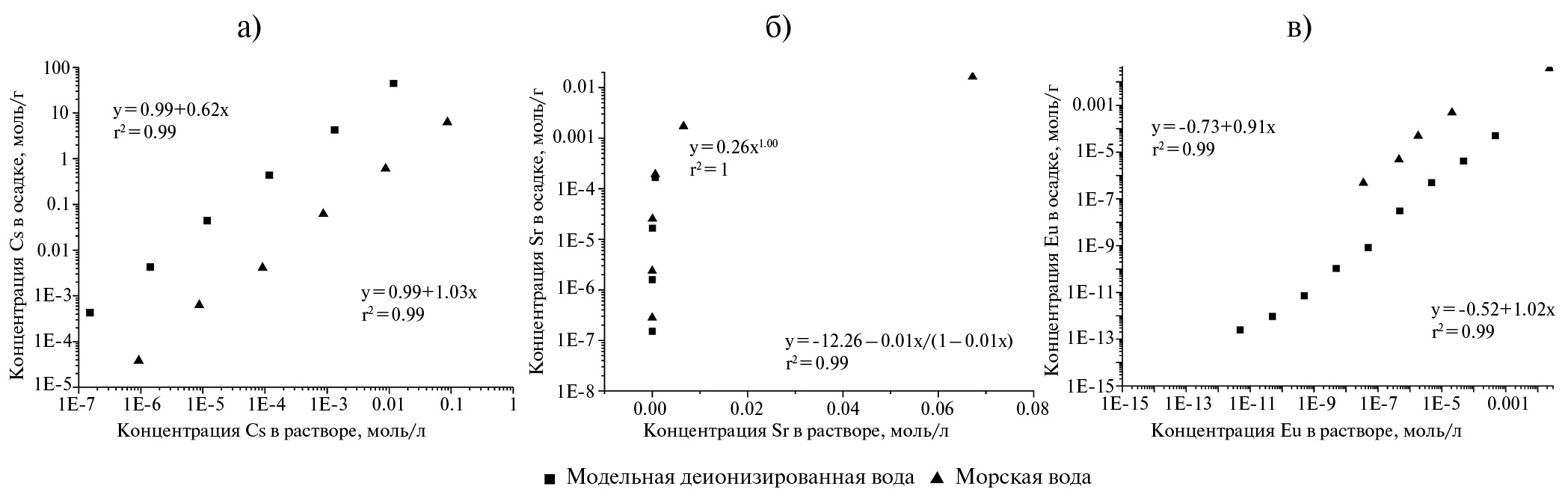 Изотерма сорбции Cs описывается уравнением Генри, Kd для модельной деионизированной воды составил 3404, морской – 61.6 (рис. 4а). Изотерма сорбции Sr для морской воды описывается уравнением Фрейндлиха, Kd = 236. Для модельной деионизированной воды кривая описывается уравнением Ленгмюра: максимальная адсорбция равна 214±28 моль/г, Kd варьирует от 200 до 600 (рис. 4б). Изотерма сорбции Eu для модельной деионизированной и морской воды описывается уравнением Генри. Kd в морской воде достигает значения 4187, что является следствием высокого сродства адсорбата к адсорбенту (рис. 4в).
