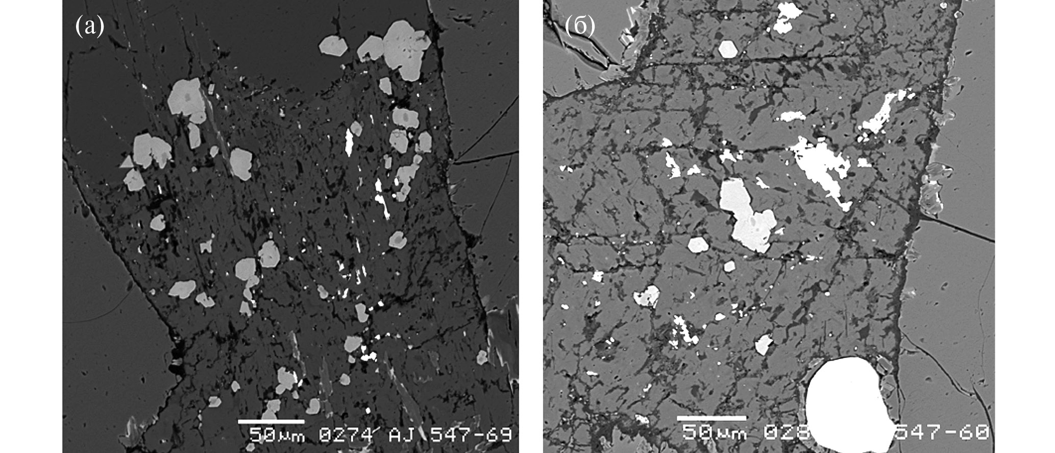 Барит в мелких до 30 мкм неправильной формы выделениях довольно широко распространен в метаморфизованных плагиоперидотитах, где наблюдается в агрегатах диопсида, тремолита, гидрогранатов, хлорита (рис. 2а, б). Поразительная особенность данного барита – полное отсутствие в его составе стронция. Поэтому на фотографиях в режиме отраженных электронов нет намека на зональное строение его выделений.