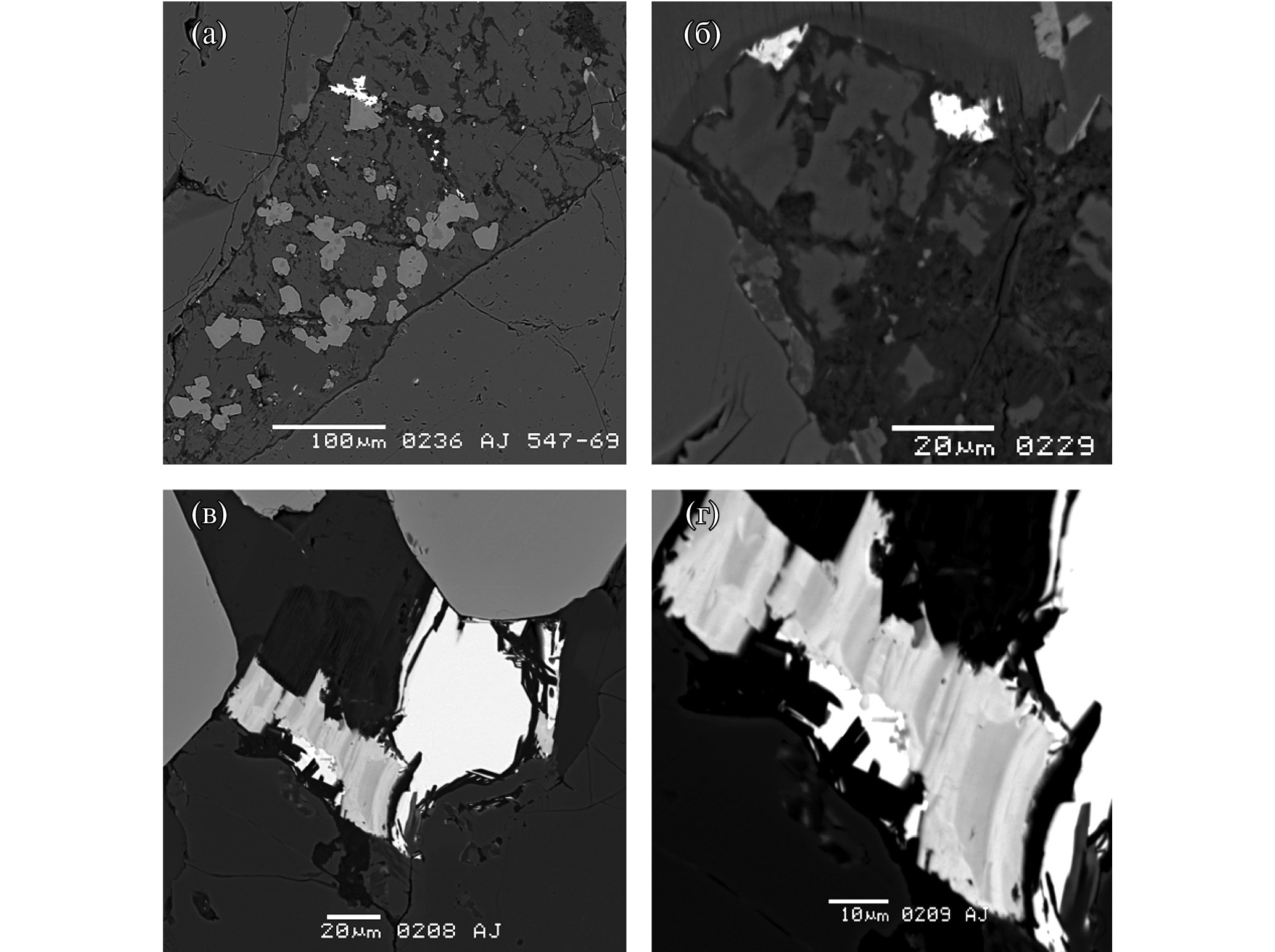 Рис. 3. Феррокиношиталит в метаморфизованных плагиоперидотитах Йоко-Довыренского интрузива: (а) – выделения неправильной формы феррокиношиталита (белое) (ан. 16, табл. 4) в агрегатах метаморфогенных гидрограната (светло-серое, ан. 9-10, табл. 3), тремолита (ан. 14, табл. 3) и диопсида (неровное темно-серое) и антигорита (черно-серое) по пироксенам и битовниту в промежутке между кристаллами кумулусного оливина (ровное серое слева и справа); (б) – неправильной формы выделения феррокиношиталита (белое) (ан. 19, табл. 4) в агрегате хлорита (ан. 7, табл. 3) и антигорита (темно-серое), замещающих пироксены (сверху) и битовнит (в центре снимка) у контакта с оливином (ровное серое слева); (в) – полиминеральная псевдоморфоза по флогопиту у гнезда сульфидов (белое) рядом с кристаллами алюмохромита (светло-серое). Флогопит замещен хлоритом различного состава, антигоритом (черно-серое и темно-серое) и феррокиношиталитом («гармошка» от светло-серого до белесого цвета); (г) – деталь рис. 3в. «Гармошка» из зональных кристаллов феррокиношиталита, внутренние серые зоны обеднены барием и хлором (ан. 15, 17, табл. 4), внешние зоны обогащены барием и хлором (ан. 18, 20, табл. 4). Справа и ниже «гармошки» феррокиношиталита – срастания троилита, пирротина и пентландита (белое). Изображения в отраженных электронах.