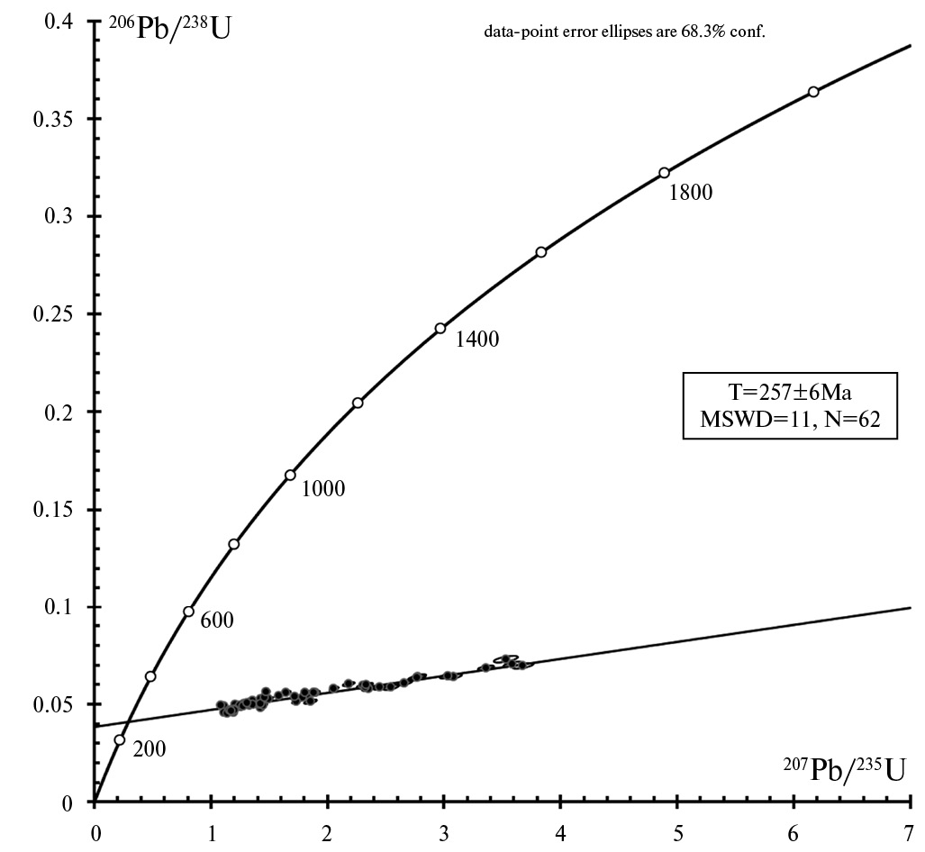 По нижнему пересечению получено значение возраста 257±6 млн лет, СКВО=11, которое близко к полученным ранее значениям возраста ряда магматических пород этого региона.