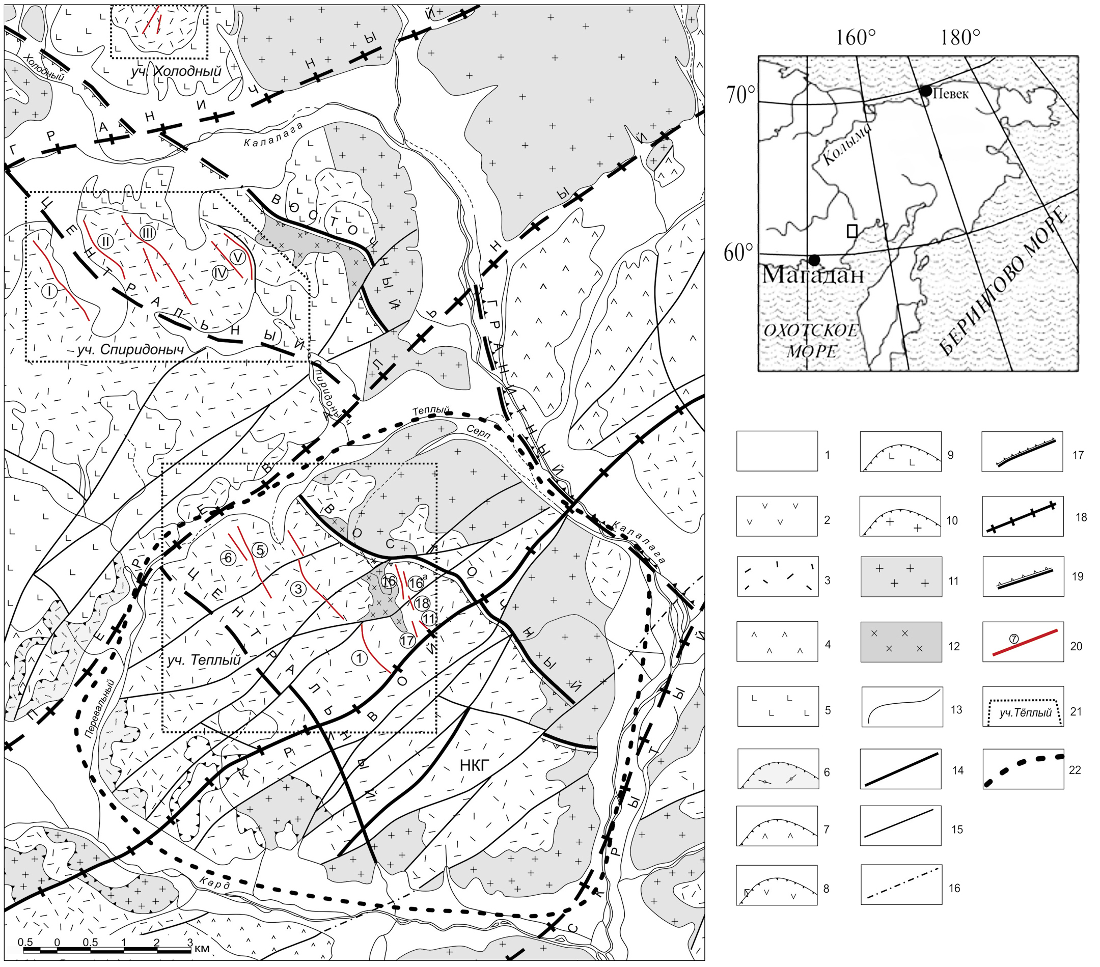 Фиг. 1. Геолого-структурная схема месторождения Приморское (по материалам ФГУП “Магадангеология” с дополнениями). 1 — четвертичные отложения; 2 — андезитовая толща; 3 — риолитовая толща; 4 — дацитовая толща; 5 — андезибазальтовая толща. Вулканические тела: 6 — риолитов; 7 — дацитов; 8 — андезитов; 9 — базальтов; 10 — гранит-порфиров. Интрузии: 11 — гранитов; 12 — диоритов; 13 — геологические границы. Разрывные нарушения и их названия: 14 — главные; 15 — второстепенные; 16 — скрытые под четвертичными отложениями; 17 — внешний кальдерный разлом; 18 — радиальные разломы кальдеры; 19 — краевые сбросы Неоколчан- Калалагинского района (НКГ); 20 — жильные зоны и жилы, их номера; 21 — контуры участков и их названия; 22 — контур ядра Калалагинской вулканической структуры.