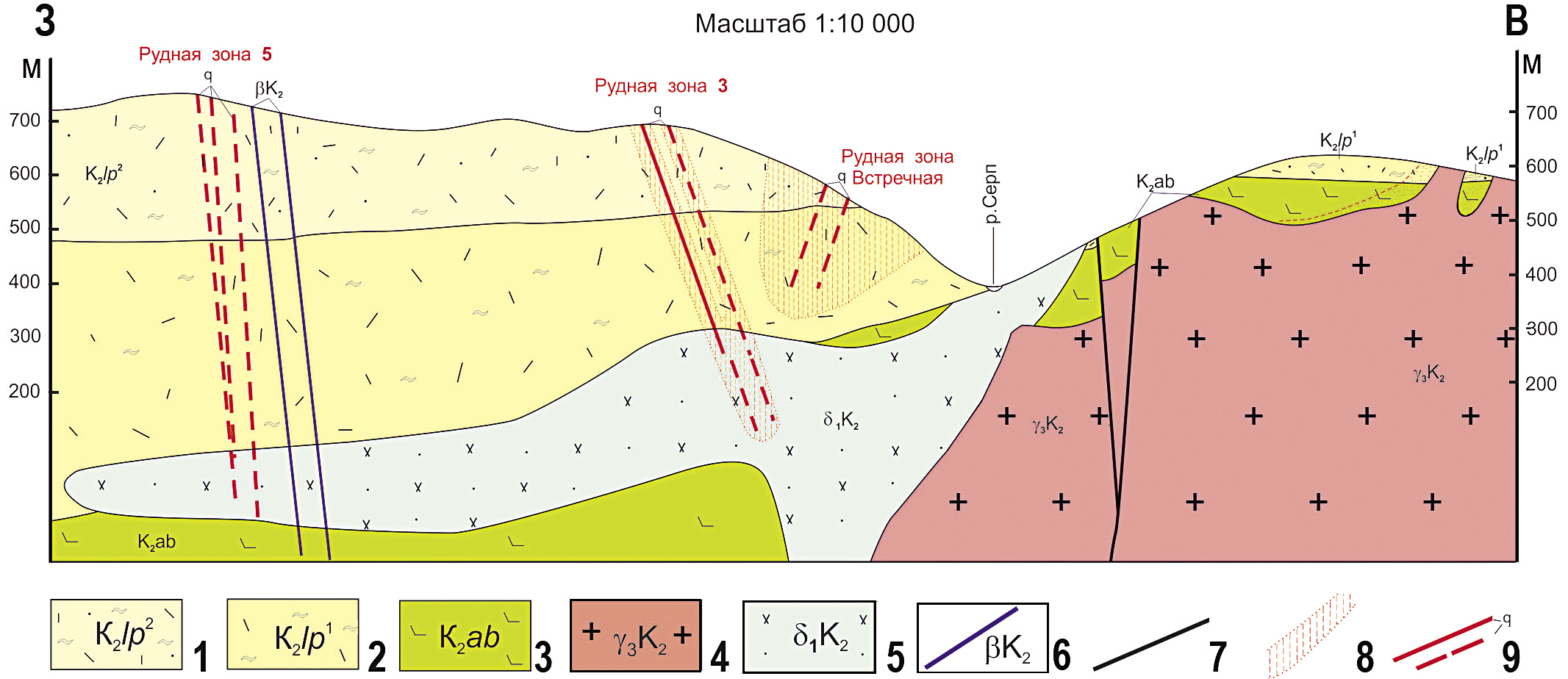 Фиг. 3. Геологический разрез участка Теплый (З-В). Масштаб 1: 10000 (по материалам ФГУП “Магадангеология”). 1 — Верхняя пачка. Игнимбриты риолитов с прослоями и линзами туфов андезитов и туфопесчаников; 2 — Нижняя пачка. Игнимбриты риолитов псаммитовые; 3 — Андезибазальтовая толща. Андезибазальты, базальты, их кластолавы; 4 — граниты; 5 — диоритовые порфириты; 6 — дайки базальтов; 7 — разрывные нарушения; 8 — гидрослюдисто-кварцевые метасоматиты; 9 — Ag-Au кварц-родонитовые жилы.