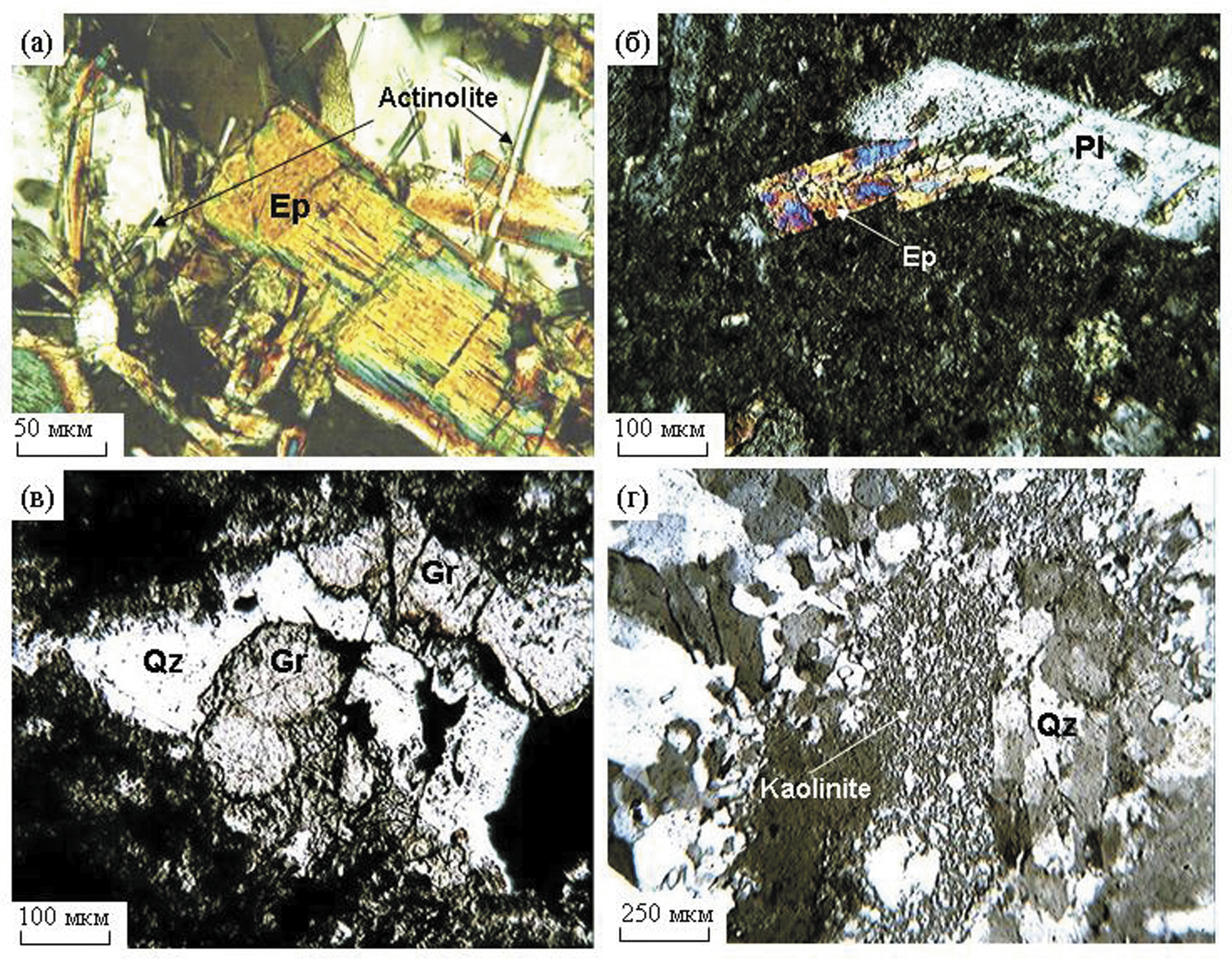 Фиг. 4. Метасоматиты месторождения Теплое: а — высокотемпературные эпидот-актинолитовые; б — коррозия плагиоклаза эпидотом в метасоматически измененном андезите; в — метасоматический (наложенный) гранат в кварците; г — низкотемпературные кварц-каолинитовые метасоматиты (на периферии вулкано-интрузивного купола).