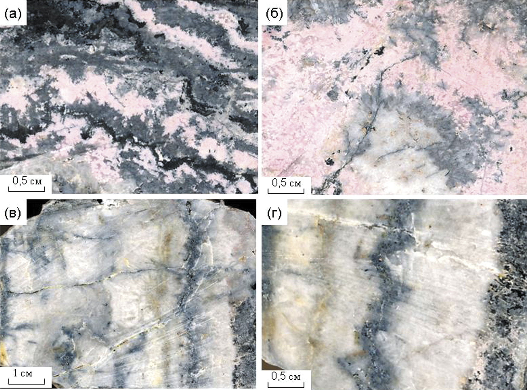 Фиг. 6. Колломорфно-полосчатые текстуры руд месторождения Теплое. а–б — термометаморфизованные кварц-родонит-пиролюзитовые руды, обогащенные акантитом; в–г — кварц-халцедон-адуляр-гидрослюдистые руды, не затронутые процессом термометаморфизма, со скоплениями тонко-вкрапленных сульфидов: галенита, акантита и полибазита в темных прослоях.