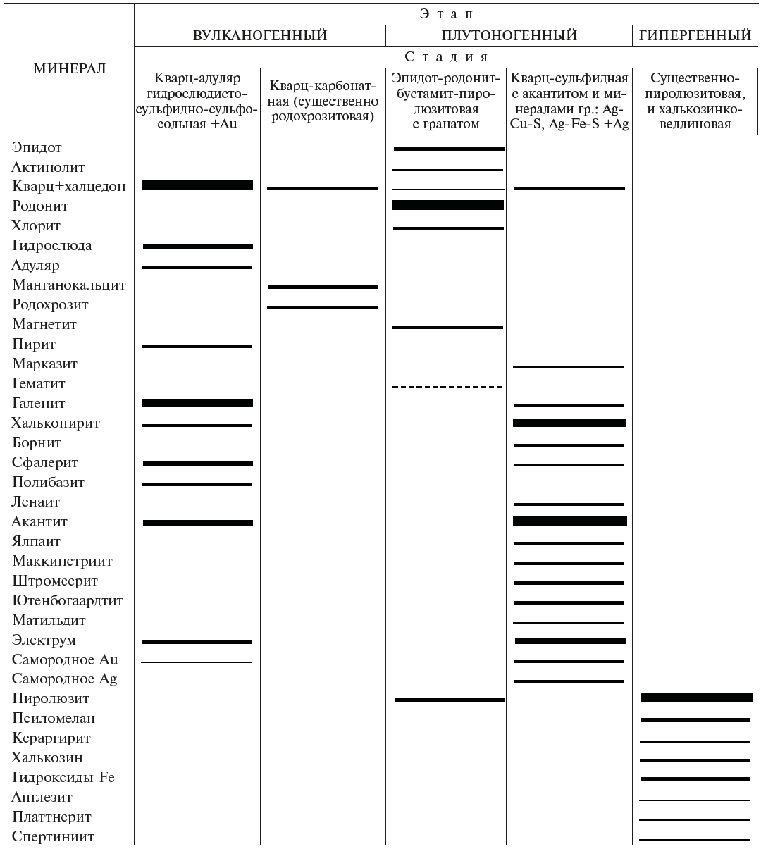 Поздний этап характеризуется высокотемпературным метаморфизмом ранних эпитермальных жил, привносом существенного количества Cu, присутствием Bi-содержащего галенита и матильдита в рудах. Температуры гомогенизации ФВ в кварце этого этапа варьируют в широком диапазоне от 120–347 °С до 434 °С по (Стружков, Константинов, 2005). Отмечаются признаки реювенации рудообразующей системы. В результате образуются хлорит-эпидотовые с актинолитом средне-высокотемпературные фации околорудных метасоматитов, а в рудных телах — гранат-магнетит-родонит-эпидотовая минерализация, как и на крупном Ag-Au месторождении Дукат (Серебро …, 1989); также наблюдается вынос Sb и перераспределение Ag c отложением широкого круга Cu и Fe сульфидов (табл. 2).