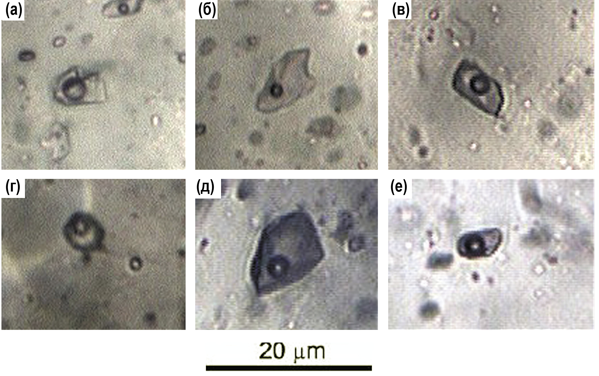 Микротермометрические исследования ФВ выполнены при помощи измерительного комплекса, созданного на основе микротермокамеры THMSG-600 фирмы Linkam (Англия), микроскопа Motic, снабженного длиннофокусным объективом 50Χ фирмы Olimpus, видеокамеры Moticam solution 3 M.px и управляющего компьютера. Концентрация солей для включений рассчитывалась по температуре плавления льда (Тпл. льда) с использованием данных из работы (Bodnar, Vityk, 1994). Солевой состав растворов определялся как по температурам эвтектики (Борисенко, 1977), так и в водных вытяжках (ВВ), приготовленных по методике (Кряжев и др., 2006) и проанализированных на атомно-эмиссионном спектрометре Agilent4100 MP-AES в СВКНИИ ДВО РАН. КР-спектроскопия проведена в ДВГИ ДВО РАН на дисперсионном Раман-микроскопе Lab Ram HR в широком спектральном диапазоне 150–3800 см-1, с возбуждающей линией 514 нм He-Ne лазера и спектральной шириной щели 2 см-1 (аналитик Е.Е. Колова). Разложение сложных контуров проведено с помощью программы Origin 7.5. Оценки концентраций солей и давлений водяного пара проводились с использованием программы FLINCOR (Brown, 1989).