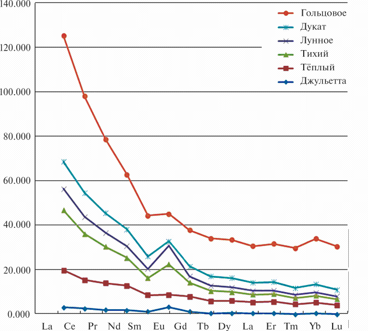 Для изученных руд установлены достаточно низкие значения ΣРЗЭ, которые в среднем составляет 24.36 (табл. 8). Такие же низкие суммы концентраций РЗЭ характерны для эпитермальных руд Омсукчанского и других рудных районов ОЧВП (Кравцова, 2010; Волков и др., 2017) и мира (Кураминского, Узбекистан, Банска-Штьявница, Словакия и др.) (Винокуров и др., 1999). Отметим, что сумма концентраций РЗЭ в изученных рудах (табл. 7) заметно ниже, чем во вмещающих магматических и вулканических породах ОЧВП (Кравцова, 2010). Нормированные на хондрит средние значения РЗЭ в рудах участка Теплый образуют слабо наклонные близхондритовые спектры (фиг. 13), во многом сходные по конфигурации со спектрами РЗЭ вмещающих пород (Кравцова, 2010).