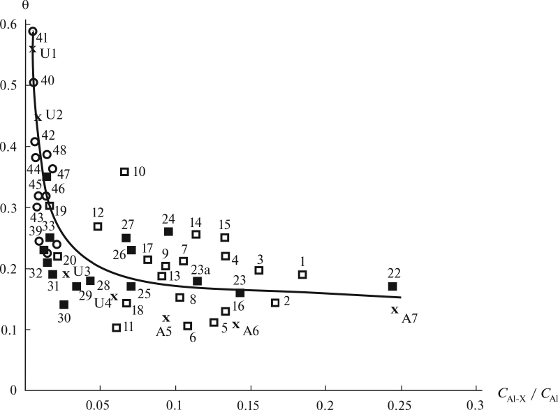 Можно выделить условную границу, разделяющую образцы групп “U” и “A” на графике фиг. 6. Ей отвечает интервал значений отношения CAl-X / CAl, приблизительно равный 0.04–0.1. Точки, расположенные внутри этого интервала, следует считать пограничными между группами “U” и “A”.